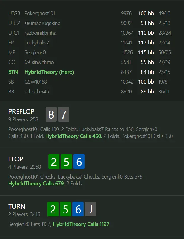 Я на BTN (85 бб) з 87s - кол. Не те щоб я дуже люблю стрибати у такі мультивей поти із спекулятивними руками, але маємо позицію на всіх і великі стеки, що створює приємні потенційні шанси банку. Тож можемо подивитись флоп з такою перспективною рукою і розібратися.