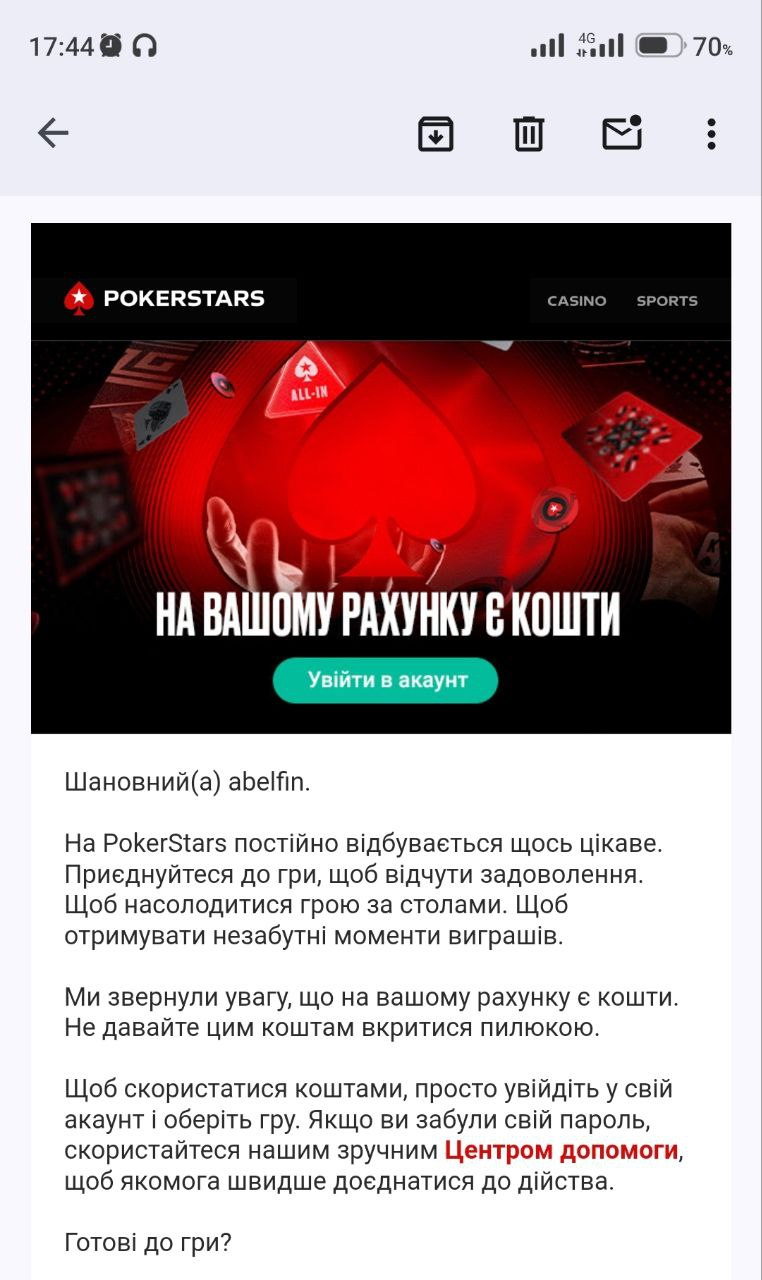 Повідомлення не нове по формі. Таке приходить з різних румів на пошту, коли якийсь час не граєш - і тобі закидують на ак якихось пару-п'ятірку турнірних долярів, щоб тебе повернути "в сім'ю". Подумав - Старзи "погладили" Прочитав - ржав 5 хвилин. Суть месенджа - в тебе ще є на рахунку кошти, а їх там бути не повинно. хутчіш, бо ми стурбовані!!! Зробили мені ржачний понеділок. Найс саппорт 🤣🤣🤣