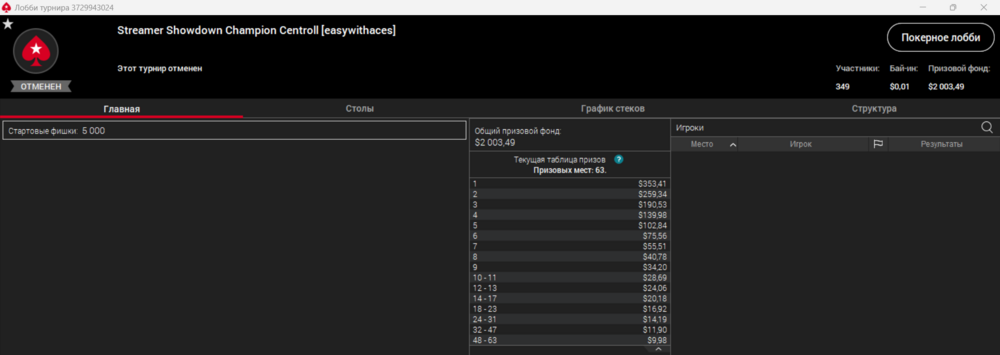 Я також вибрав одного стрімера і зарегався в його турнір за цент сподіваючись знов підняти трошки грошей майже без вкладень)) Але ПС знов не здивував і просто все відмінив))