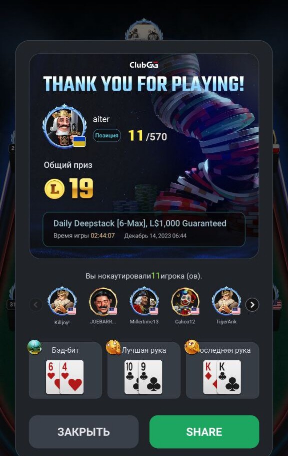 Всім привіт!)чесно нема на що жалітись(майже),з останніх зіграних турнірів на GGclub,всі були в ітм,переважно це білети нажаль,але вже краще ніж нічого,вчора знову сидів до 4 ночі щоб зіграти турнір і не даром)цього разу вдалось виграти live$,радий і цьому,та могло бути більше остання роздача за норм стек,і вихід на фіналку,а можливо і виграш у туріку👇