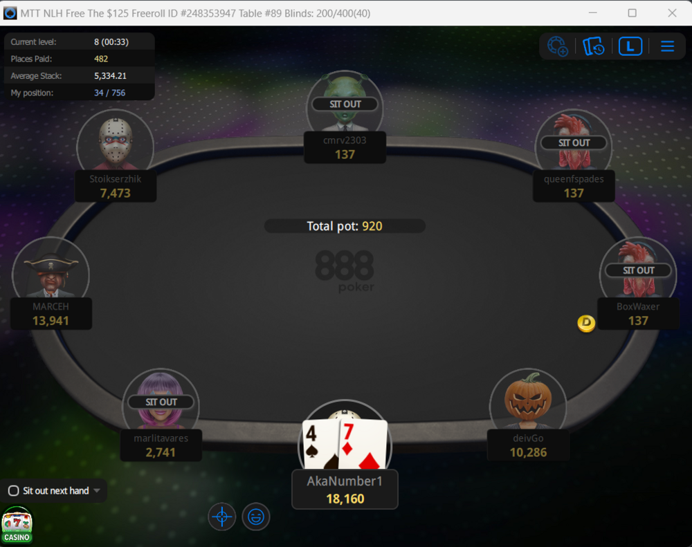 Після цієї роздачі,я вже не заходив в гру бо не було з чим і просто досидів до завершення,залишилось у мене 13 бб всього не супер,але шось пограю)а вдруг якийсь НОК,і 5000$ 🤯🔥або хоча б до призів досидіти,40+$ теж норм буде)ось лобі турніру)подивимось що получиться з цього всього)))