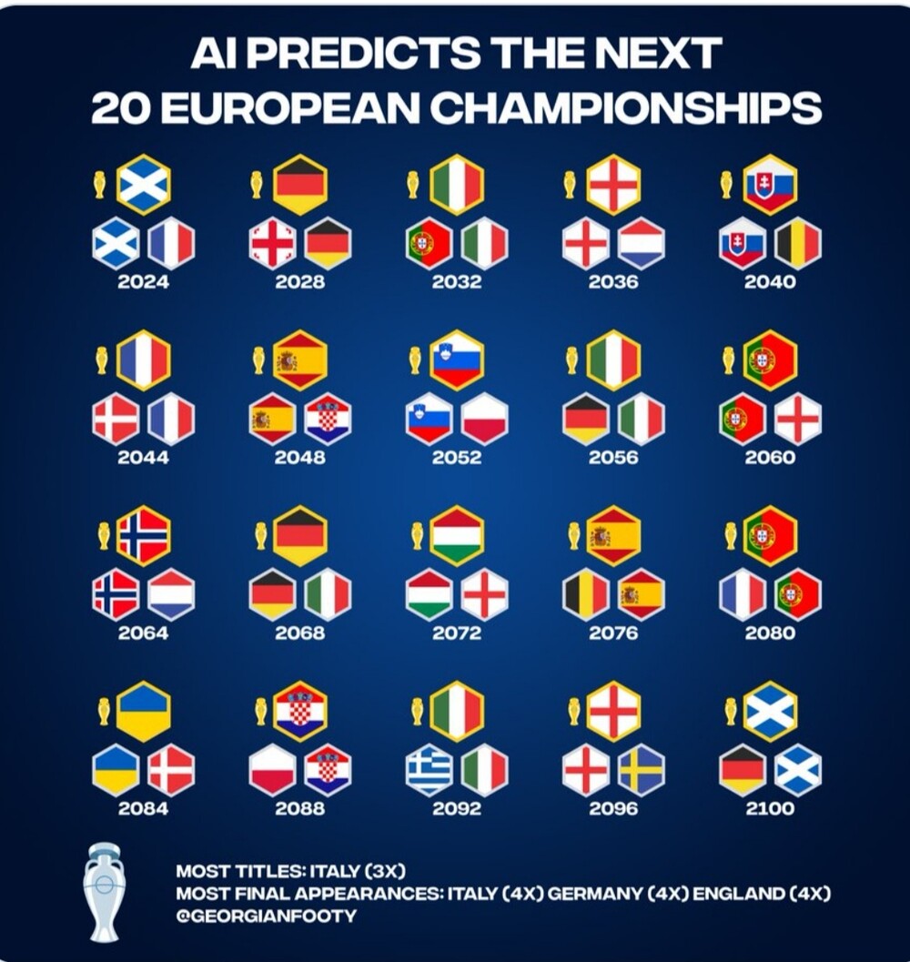 Знайшов на просторах інтернету таку картинку, це штучний інтелект передбачив всіх переможців Євро до 2100 року.