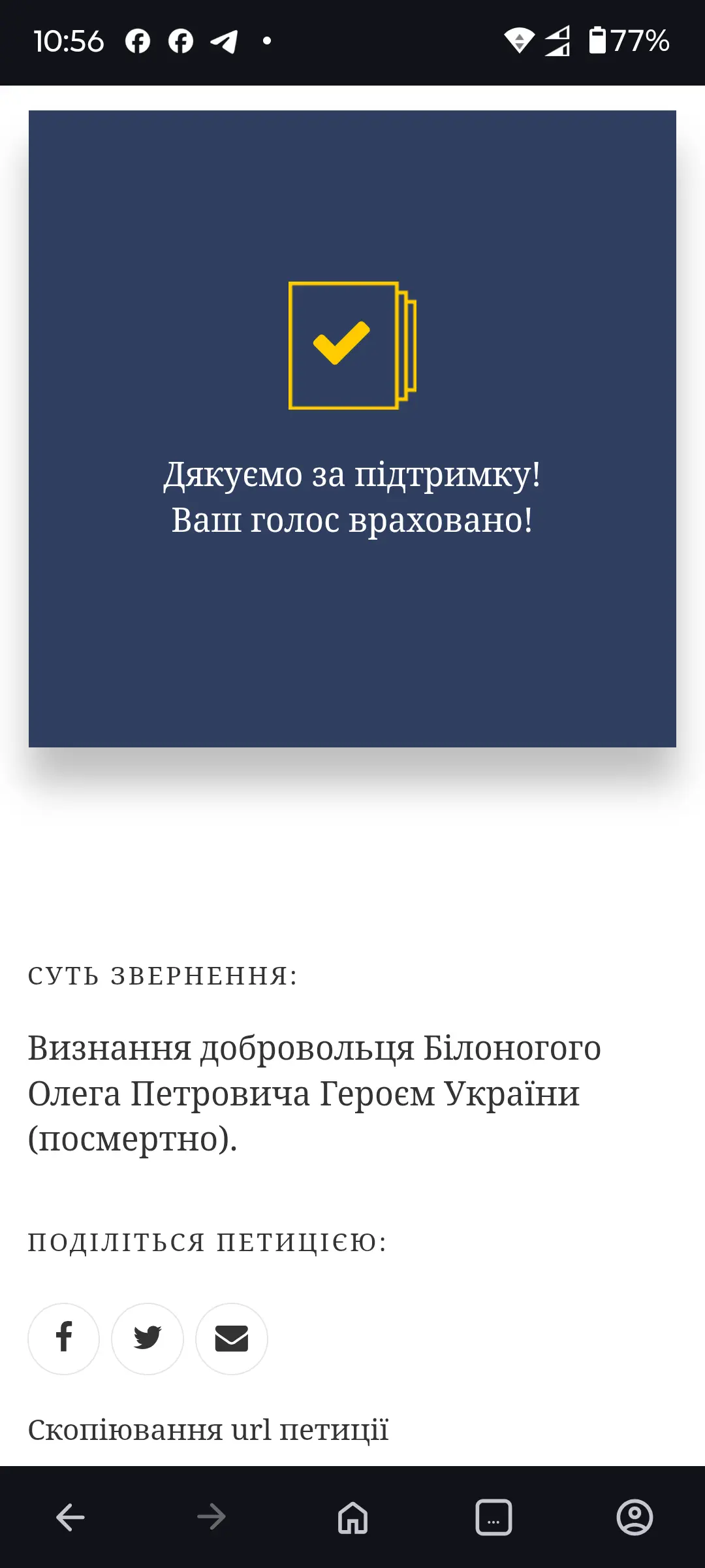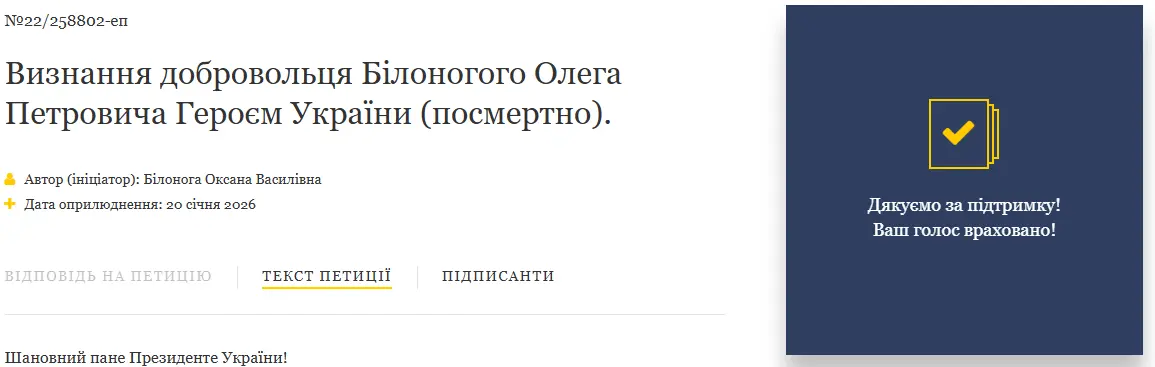 Мали надію що справимось але бачу що часу залишилось мало а ціль ще далеко. Від вас не треба ні фінансової допомоги ні будь чого материального. Просто прошу підписати петицію на присвоєння звання Героя України мого загиблого друга. Кожен підпис важливий!