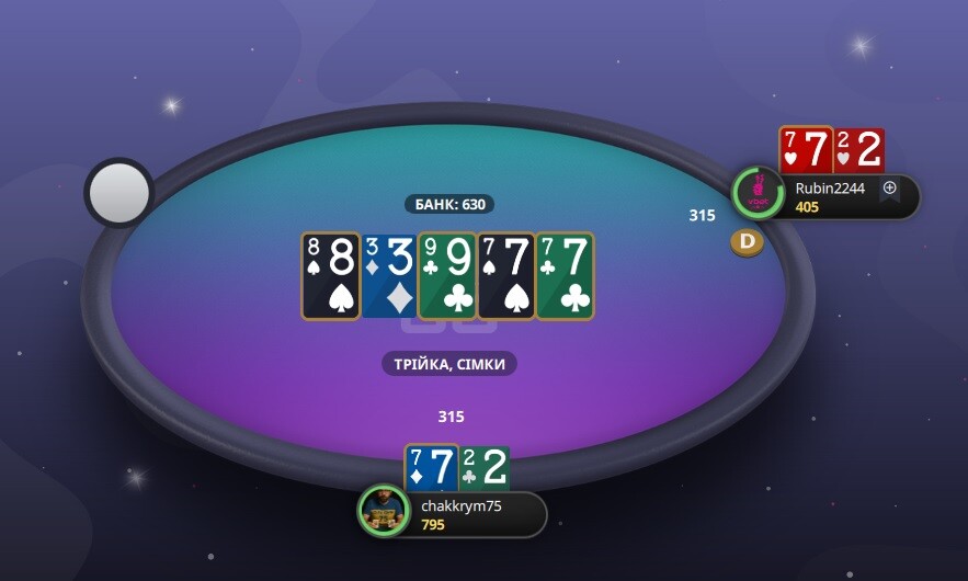 Причому повний набір нормулів за столом. Пасля другого виставлення з 75, я зрозумів, що у цій грі виграє той , хто вихопить монетку. Спочатку я з 97 попав у КК, в мене залишилось близько 100 фішок. Знову три рази поспіль я вистався з мусором і монетка на мою користь. А в останій АК встояли проти Д7. Отакий нормуль.😁😁😁