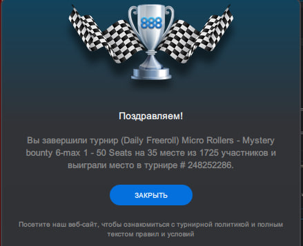 Цих двох роздач мені вистачило щоб попасти в призи,але не без підкрутки зі сторони 888,у топ 100,я був на 50+ місці з стеком 2бб,і не зіграв жодної роздачі,бо мене 3 рази пересадили,і я проскочив всі блайнди,а останній 4 раз посадили на батон,і ще плюс 20 секунд часу,а людей лишилось 60,у мене 0.9бб,звісно всі тягнуть,і через 3 роздачі оп і я в призах)міг ще сидіти пару роздач до свого ВБ)