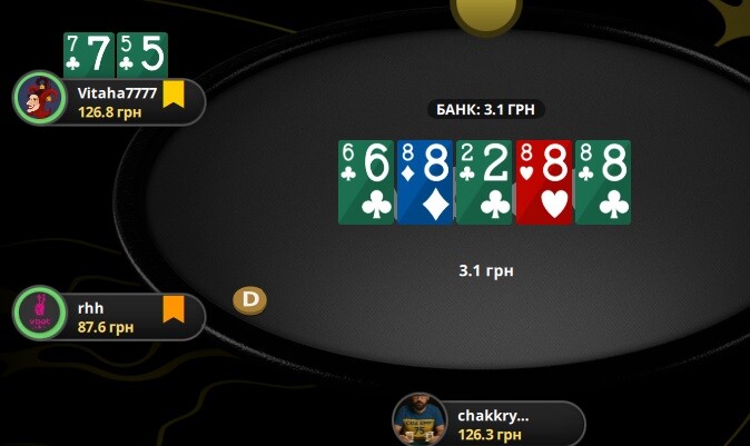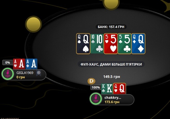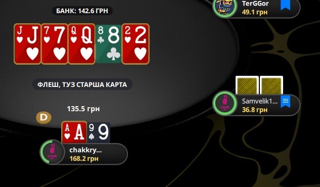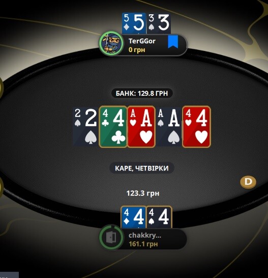 Тут виставилися на тьорні. Я думав КВ, ДВ чи навіть однакові, навіть сета не давав і Х5 не уявляв. Бо він просто на префлопі вколив мій рейз і на флопі протелефонував. На тьорні я запхав, він швидко відповів. Ого!!!! Доїхало (ухухухухуху). Видихнув.