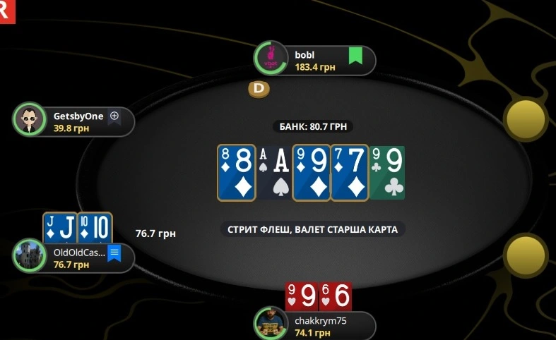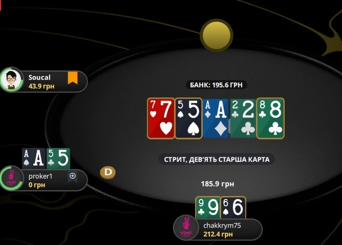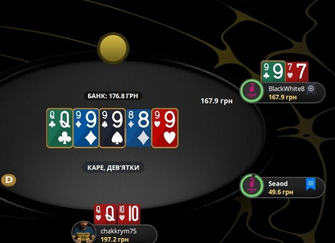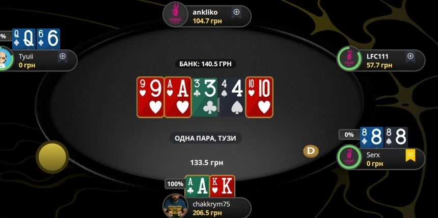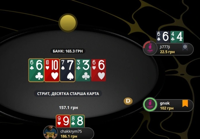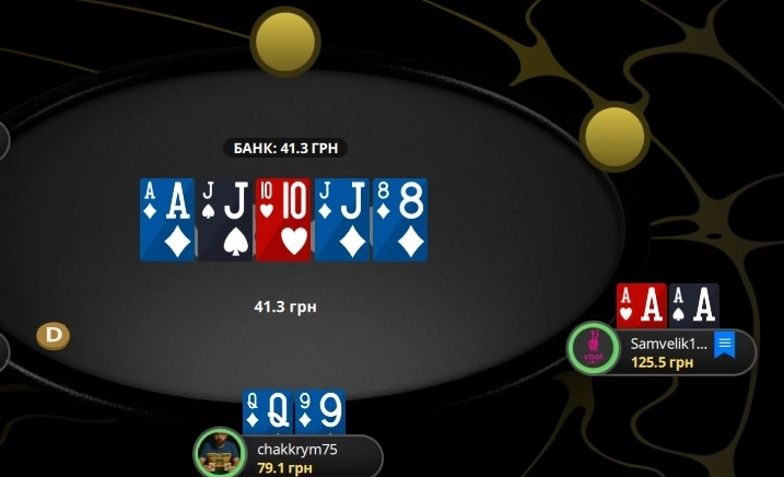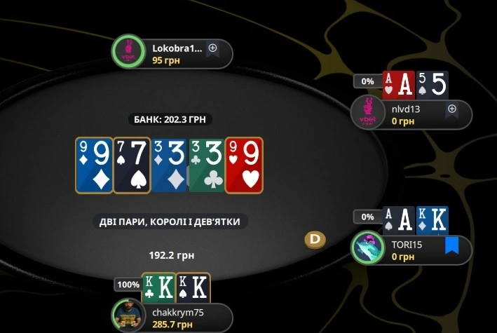По грі.сЬогодні все відбулось навпаки. Спочатку я підняв до +3БІ, а потім спустився вниз до -1БІ. Потім все ж відігрався. Залишилися помилки з мого боку , коли я занадто вперто починаю перекручувати і здаюся на останій вулиці , Одна з перших роздач коли я 3 бечу, а два опоненти колять, в мене АВ. На флопі я ловлю тріпс валетів (на флопі дві буби). Я намагаюсь заманити і просто чекаю, отримую рейз з ререйзом від суперників і сам ставлю оленя і отримую кол від одногго, іннший відпадає. Вскриваємося, у оппа 97 бубнові, я звичайно забираю свої 75% банку, бо знаю вже ці приколи. Тьорн буба, рівер буба. Ось так граємо.