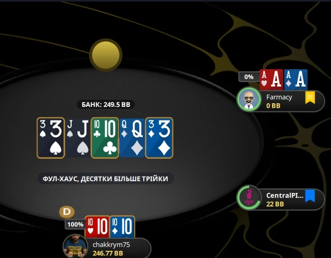 По кешу все як завжди, якісь гойдалки. На кінець сесії мав "-". Він був значно більший, але декілька роздач у кінці трохи врятували. Десь я недопрацьовую, бо є відчуття, що вперся у стелю, донизу можу, а далі пробити до верху не можу. І так вже який день. Помилки були. Особливо коли вперся і всеж поїхав з десятками і потрапив у пастку до дівчат. А через декілька роздач з АК отримав на флопі додатково АК і поліз, а в мене оленя, ні не скину, закрив , а тем сет по третй карті на флопі. Потім майже така ж ситуація з КД, на флопі маю К Д 9, поліз, в мене знову олень, ну скинув, опп показує В 10.