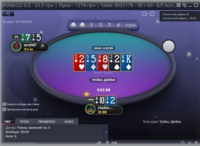 А вже у кінці знову випав Х50. Весь час був третій, а потім прийшли 10 10 , в мене 6ВБ. я виставився, мене закрили з К9s, подвоїв свій стек, через раздачу вибив одного гравця. А ХА я вже контролював, то затягнув.