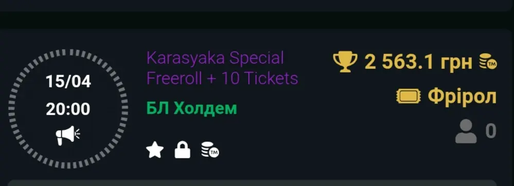 Сьогодні на вбет 20:00 Karasyaka Special Freeroll + 10 Tickets.