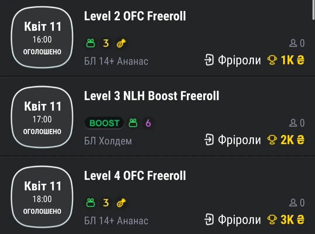 Щоб грати ці фріроли потрібен рівень досягнень level 2, level 3, level 4.