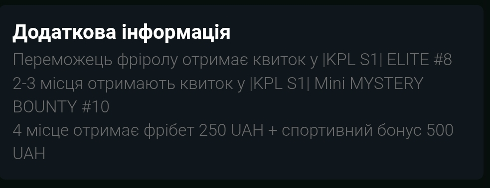 Окрім цих призів, взалежності від к-ті учасників також ІТМ у вигляді реальних грошей (тобто не ТМ-ки).