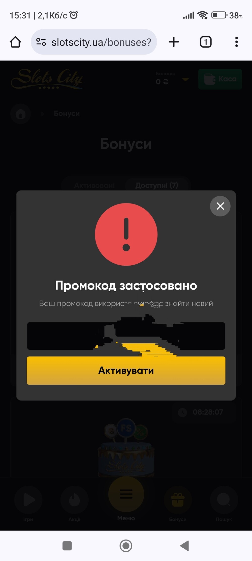 Сьогодні, як і всі фопумчани, зайшов, активував код на фріспіни. Але ні спінів ні бонусів немає