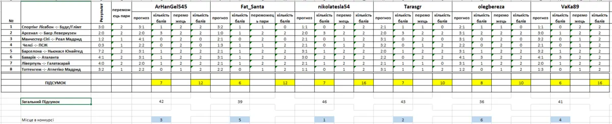 Арсенал прогнозовано переміг Баєр і продовжує шлях до фіналу. Цей результат точно угадали половина конкурсантів і отримали по 3 бали. Решта теж прогнозували перемогу англійців і отримали свої бали. І звичайно всі вірили в перемогу Арсенала за що теж отримали по 2 додаткових бали.