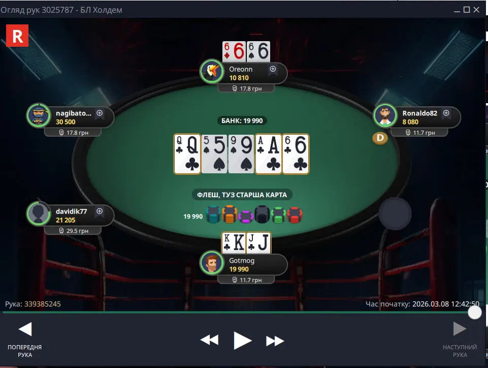 Одну карту не хватило до флеш роялю, тому просто флеш😁