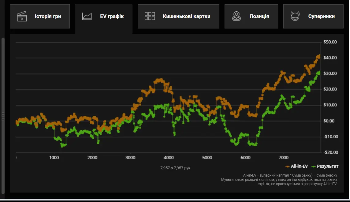 Зіграно 7957 роздач. Профіт склав 1.54$. На графіку видно як відбувалась гра.