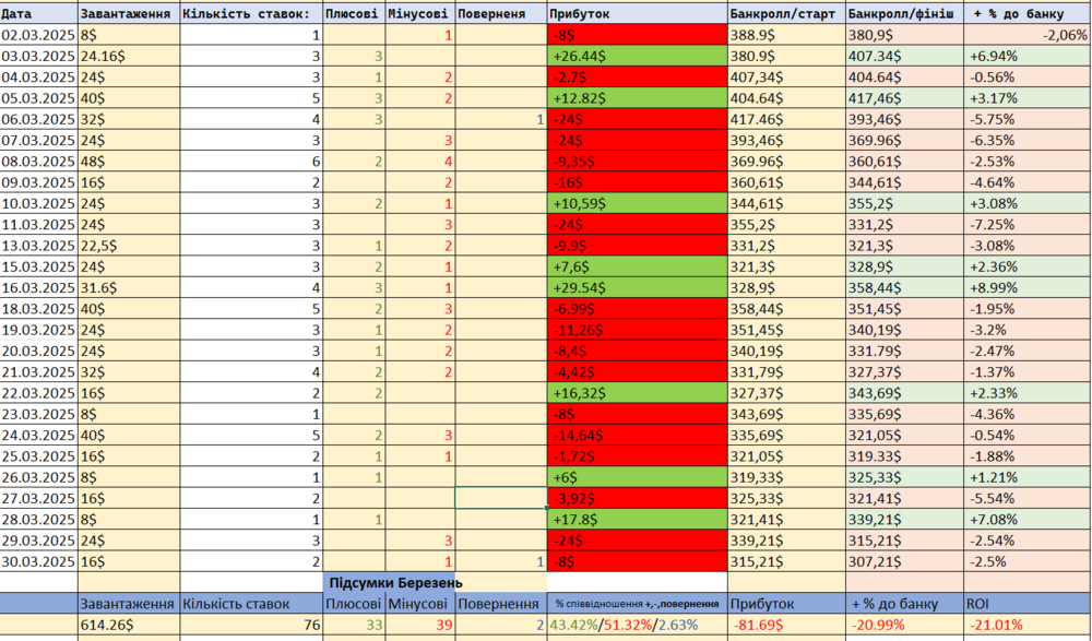 Закриваємо Березень в мінус. План на наступний місяць давати менше ставок, але більш аргументованіших.