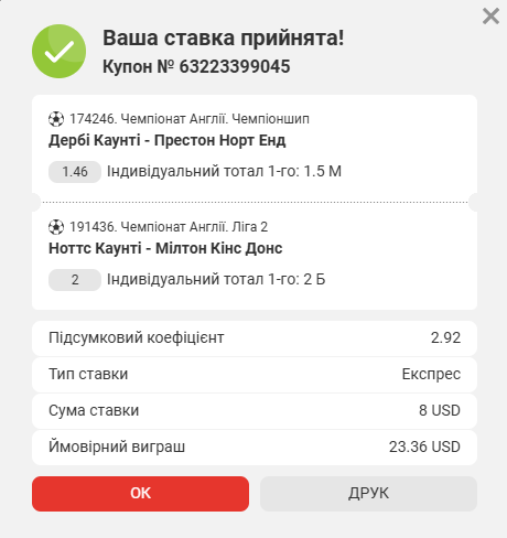 Каунті-Мілтон Хазяї виглядають непогано проти гостей, враховуючи результативність та слабкий захист суперника, очікую результативний матч, а перемогою зможуть піднятись в турнірній таблиці, маючи змогу в майбутньому боротись за синю зону проходу. Гості пропускають в 90% випадків, при тому всьому в 60% по 2гола+, забивають всього в 60%. Гості в минулому матчі проти Флітвуд пропустили цілих 4 гола, що свідчить про їх поганий захист. Враховуючи положення, очікую перемогу домашньої команди а також можна спробувати взяти іх індивідуальний тотал більше 2-х голів.