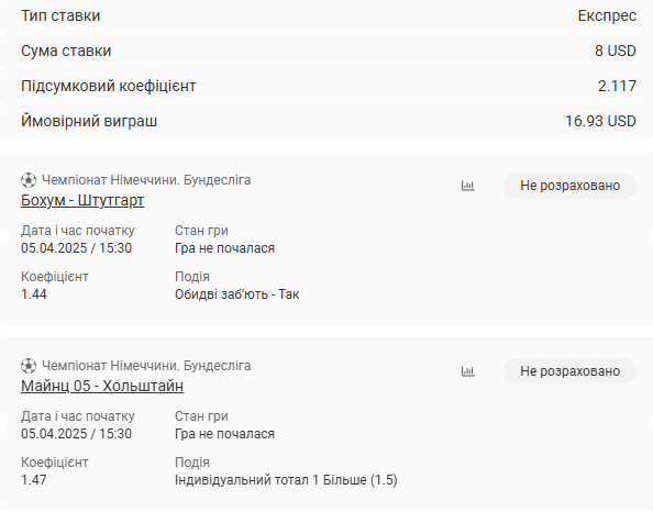 Бохум-Штутгарт Гості виглядають фаворитом, так як клас та рівень гри вище. Хазяї боряться за виживання, мають змогу вийти із зони вилету якщо переможуть що навряд чи проти таких гостей. Матч не буде легким для обох команд, гостям не слід рослаблятись так як противник також є результативним та видно що мають мотивацію, пробивають захист навіть топовим командам. Враховуючи фактор того що результативність обох гарна, та те що обилві не володіють міцним захистом очікую ОЗ. Майнц-Гольштайн Говоритимемо більше про хазяїв, находяться в дуже гарній формі, мають сильну гру від нападу та результативність, в 60% випадків пробила по 2 гола мінімум, і те проти доволі міцних команд. Тут проти явного аутсайдера я думаю ім буде набагато легче пробити цей самий тотал. Гості вміють інколи дивувати та давати відсіч, навіть якщо хазяї пропустять то це тільки змотивує на подальші голи. Очікую перемогу хазяїв, та іх індивідуальний тотал більше 1.5. Щасти!