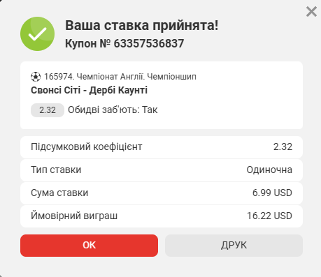 Свонсі-Дербі Останнім часом гості показують дуже якісну гру, вийшли із зони вилету, перемоагають протягом 4-х матчів підряд, і в кожному із них забили по 2 гола. На цей раз попався більш серйозний та сильніший суперник чим минулі, також з гарною результативністю. Матч буде цікавим та точно не легким для обох команд, але враховуючи не кращий захист обох очікується голи з обох сторін. В минулому матчі будучи на виїзді Свонсі витянув матч на нічию пробивши 2 гола домашній Лідс, що підтверджує те що мають силу в пробитті захисту доволі міцним командам. На мій погляд оз має доволі високі шанси, Свонсі виглядає солідніше але і гості на мотивації вміють дивувати, кф дуже гарний. Щасти!