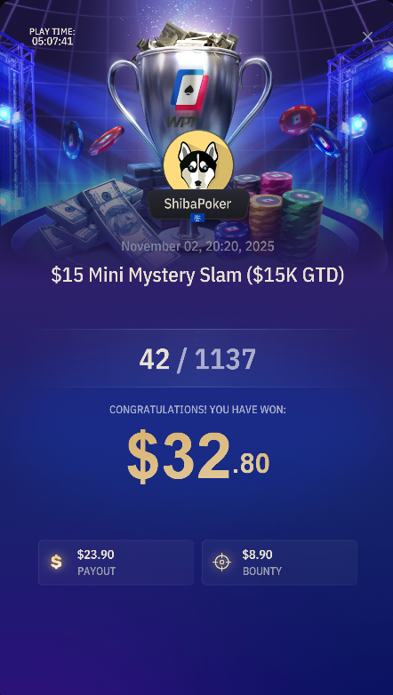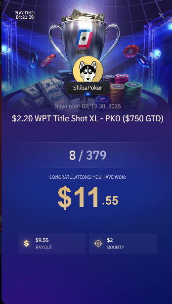 Так як я катаю кеш в основному вранці і не дуже багато, то вирішив замутити для себе марафон по МТТ у вільний час. Буду стартувати із 100$ на abi 2, БР менеджмент агресивний, не раджу так робити, але у мене є завжди змога спробувати ще раз якщо закатаюсь😃. Відкатав уже три невелички сесії. Першу сесію почав на Pokerstars і WPT щоб протестувати цей рум, не соромився грузити сателіти по 1 і 1.5. На стразах відкатав в ~0, із цікавого те що відібрався на 11 Mini Fenomeno, але безуспішно. А на WPT відібрався на 15 Містері і непогано задіпранив: На другу сесію задепав на ГГ і катав уже три руми, гру на ГГ можна описати цим скріном: Поїхали префлоп. На ВПТ справи йшли непогано, багато діпів, але нічого особливого, найкращий результат: