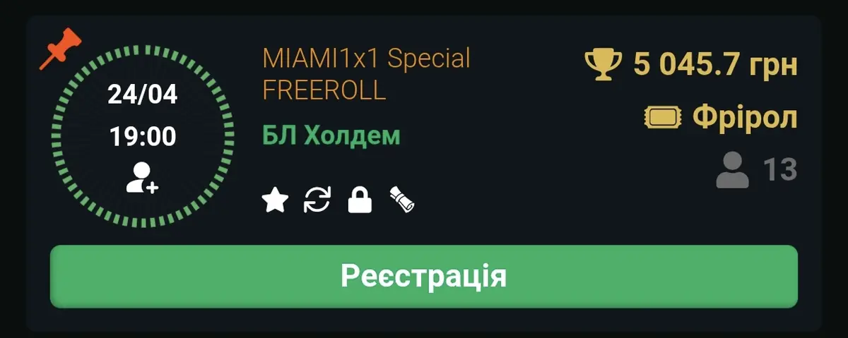 Початок: 24.04 0 19:00 Гарантія: 5,000 грн Бай-ін: 0 Ре-ентрі: 2 (безкоштовні)
