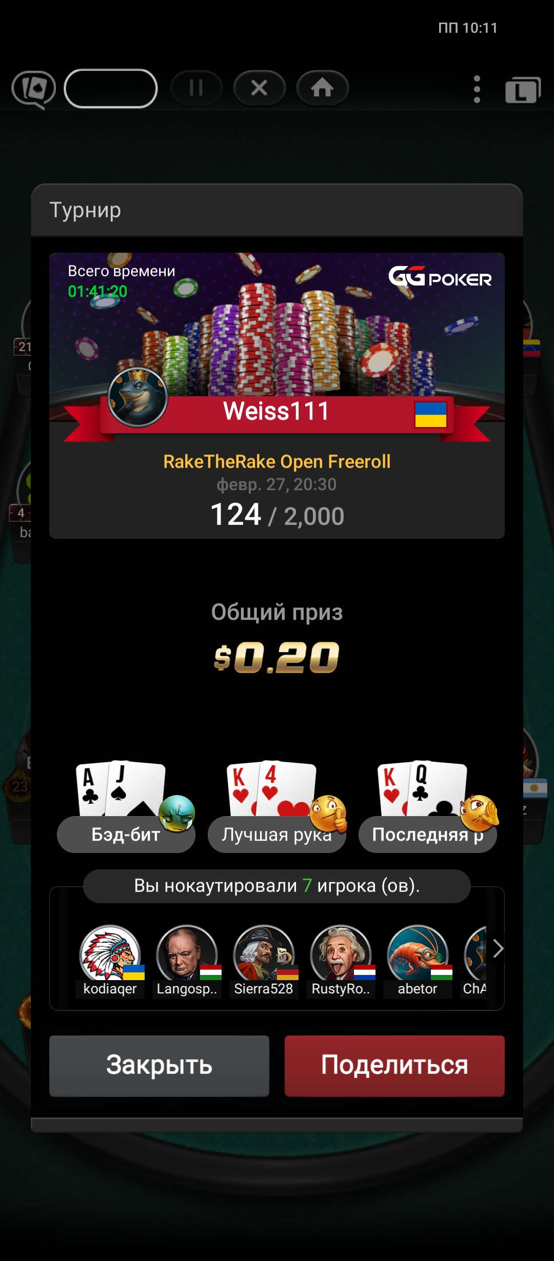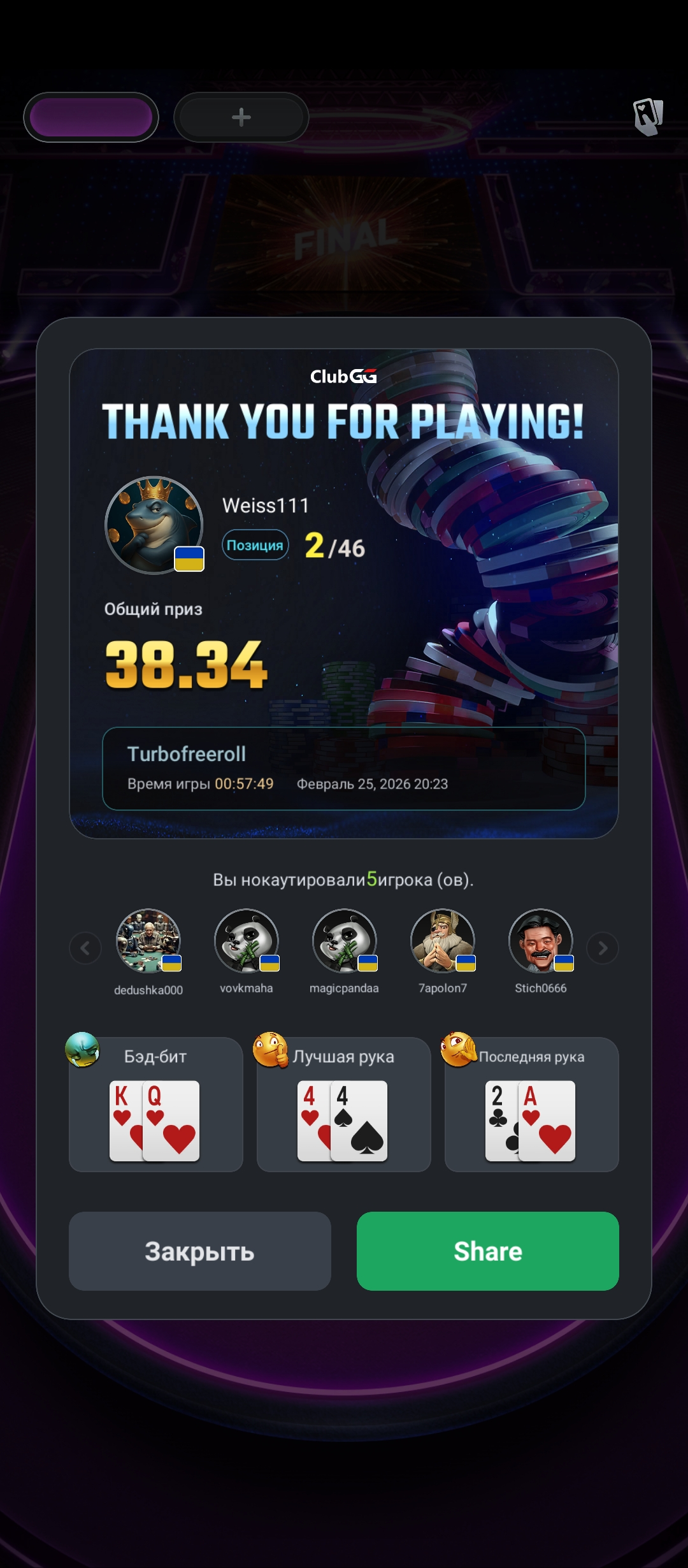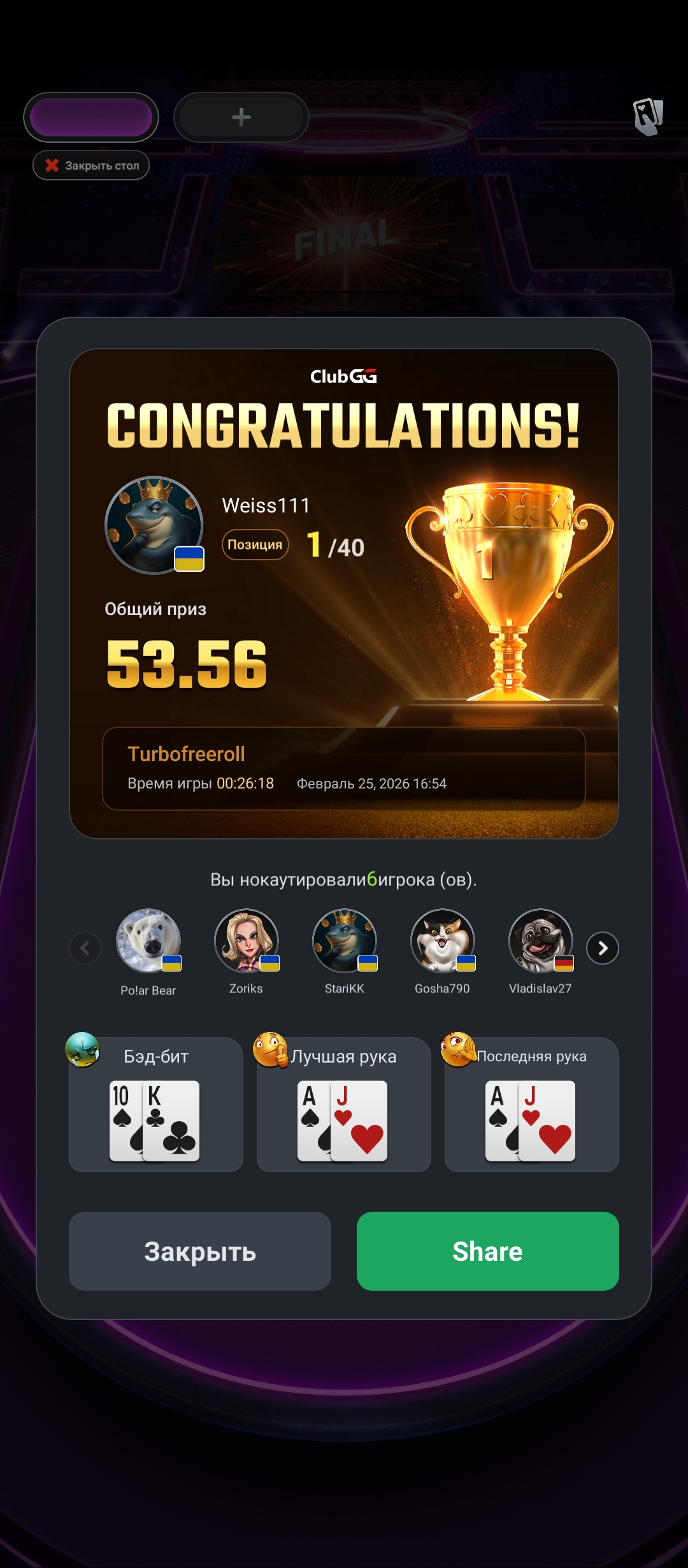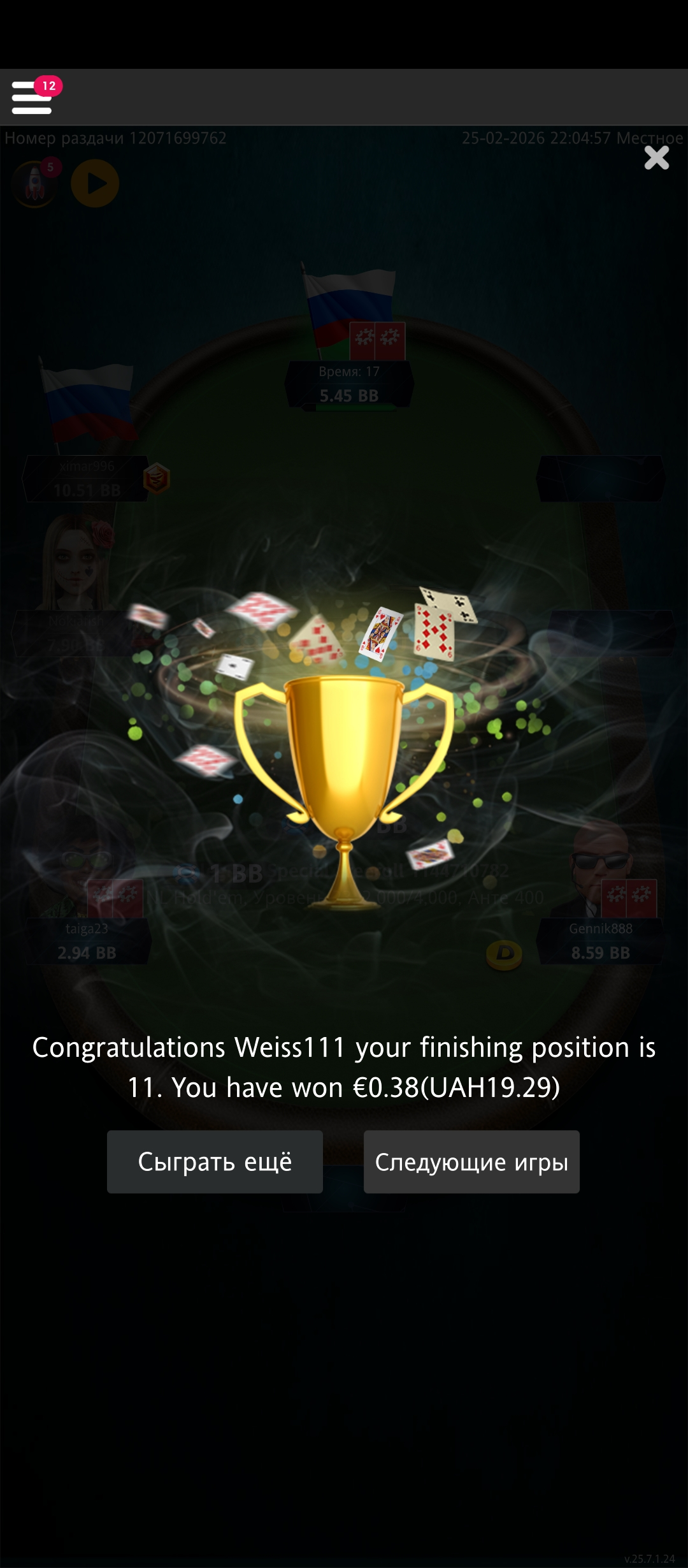 Мій марафон: Від 0 до вершин — граю без депозитів! Друзі, хочу поділитися з вами початком свого нового етапу в покері. Я у цій грі вже 8 років, бачив багато, але зараз вирішив кинути собі виклик: грати чисто з нуля, без жодного поповнення рахунку. 🚀 Покер для мене — це не просто азарт, а стратегія і витримка. На сьогодні я активно граю на 6 різних покерних майданчиках, шукаючи найкращі можливості для розкрутки банкролу. 🏆 Перші результати вже тут! Нещодавно мені вдалося круто "занести" на Vbet, і це лише підтверджує, що стратегія працює. Але справжня гордість — це мій свіжий результат у турнірі Visnyk Mystery 30k UAH на Grompbet. Ось як це було: Турнір: Visnyk Mystery (фрірол). Мій результат: Посів 3-тє місце серед величезної кількості учасників. Виграш: Забрав топовий баунті — 12 752.3 грн! Статистика: У турнірі було 382 входи та 196 реентрі, а загальний призовий фонд склав понад 30 000 грн. Це ідеальний старт для марафону "з нуля". Коли ти не вкладаєш власні кошти, а завдяки знанням забираєш п'ятизначні суми — це дає неймовірний буст мотивації. 💪 Буду щиро вдячний за вашу підтримку! Попереду багато гри, аналізу та нових перемог. Слідкуйте за оновленнями, далі — більше!