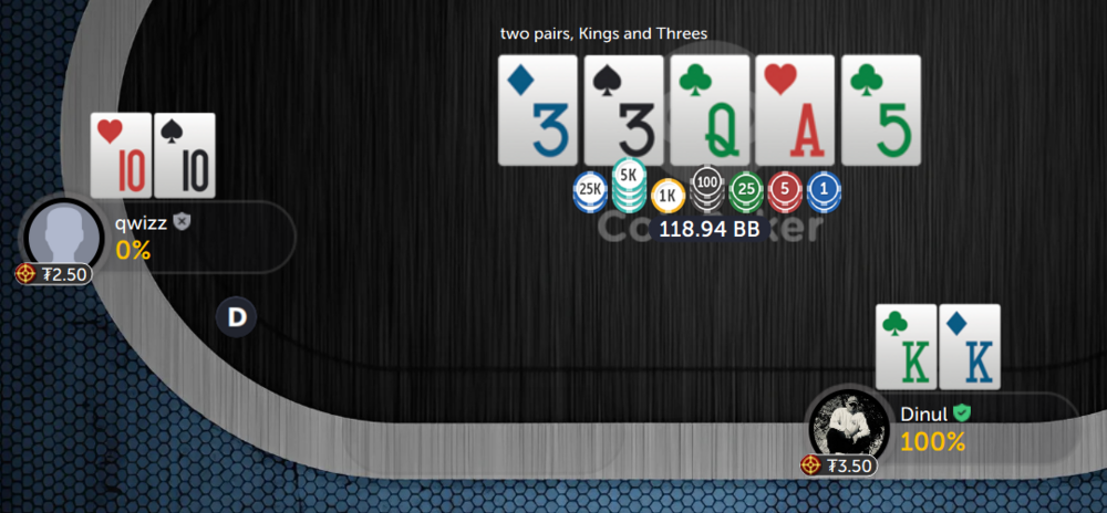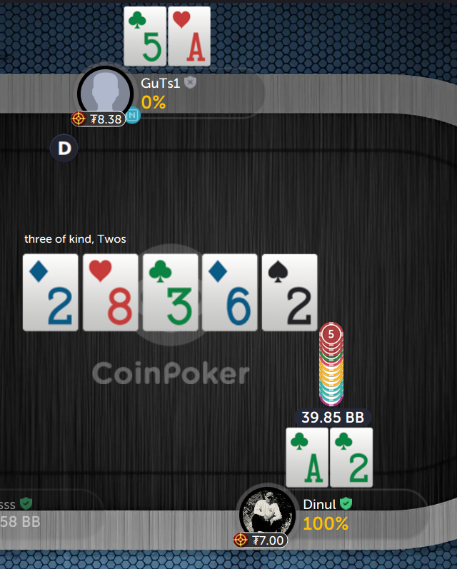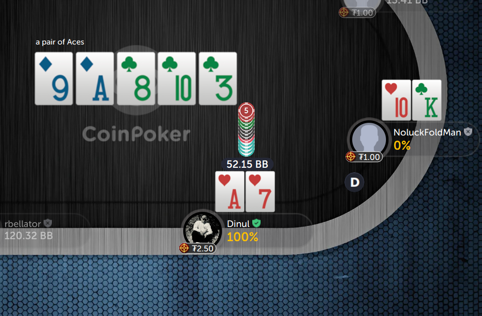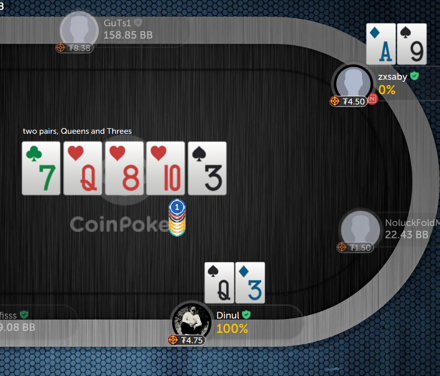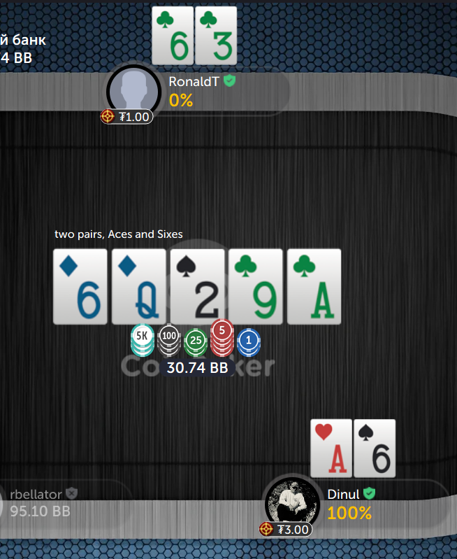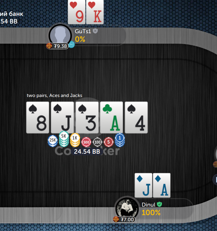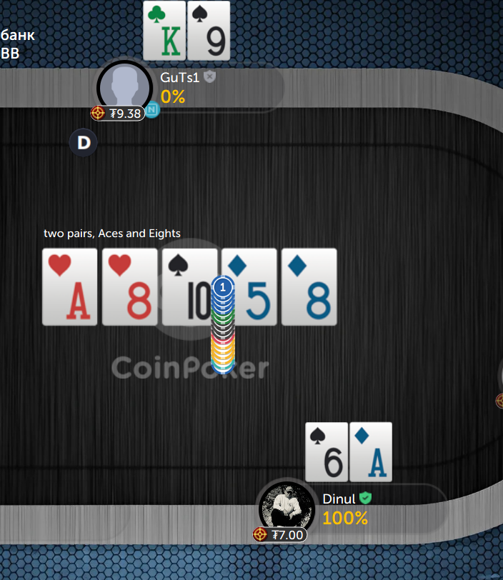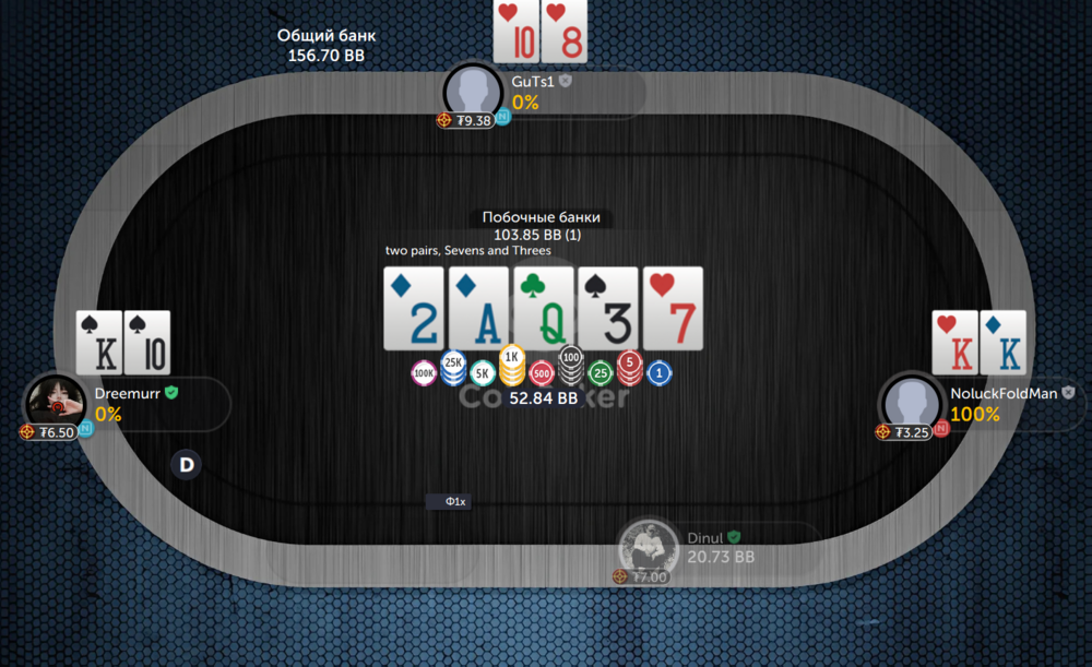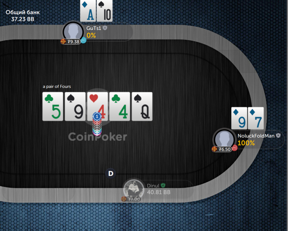 Фінальнй стіл. Після цієї роздачі залишилось 4 вб. Але далі пощастило відновити стек...
