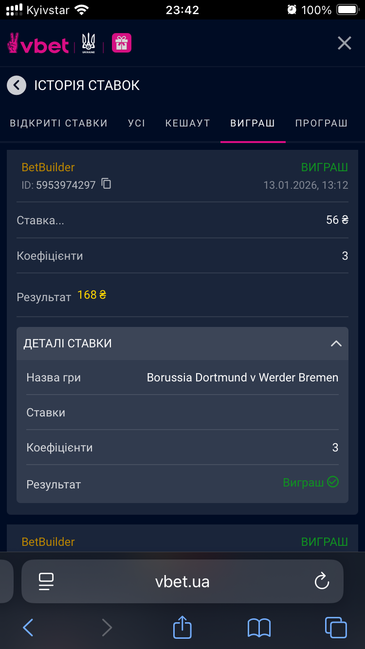 Перший матч Штутгарт-Ейнтрехт. Я Зробив ставку на перемогу Штутгарта 1 тайм та перемогу у матчі. Вийшло щось таке : 2-й матч Борусія-Вердер . Перемога Борусії 1і2 тайм.Вийшло так:Дрібниці але приємно і футбольчик цікавіше переглядати .⚽️ В мене на даний час все.Всім бажаю мирного неба та звісно удачі.🤝👍😉😁😁😁