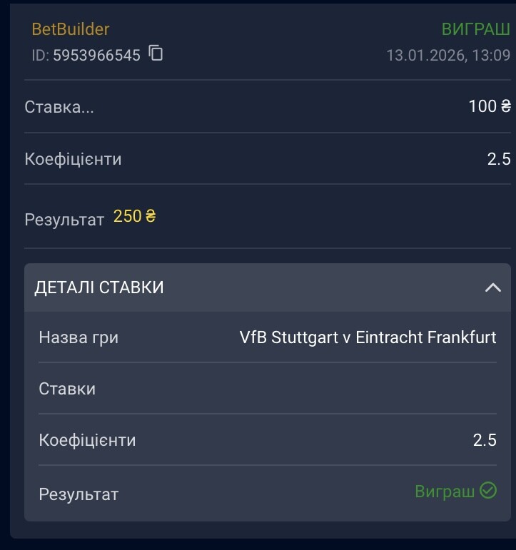 Перший матч Штутгарт-Ейнтрехт. Я Зробив ставку на перемогу Штутгарта 1 тайм та перемогу у матчі. Вийшло щось таке :