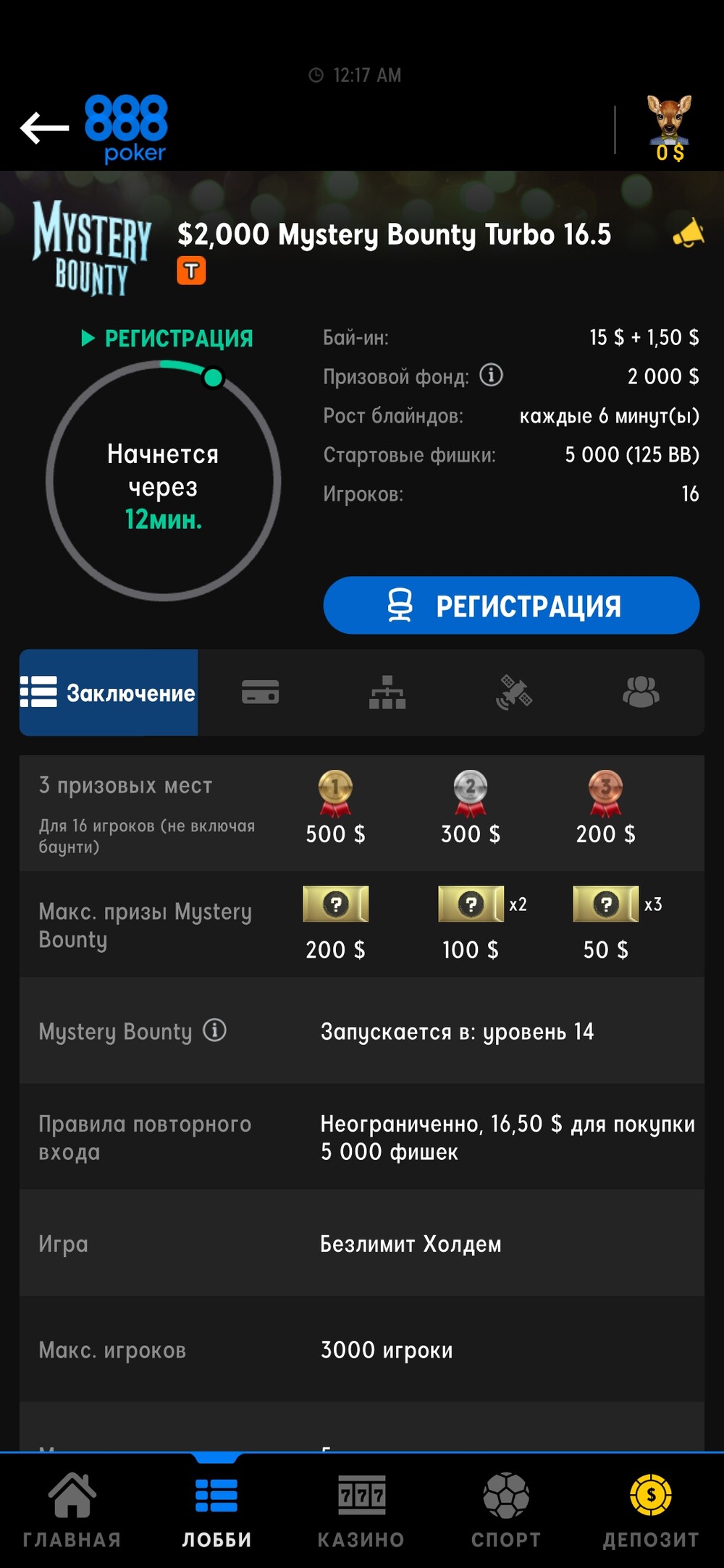 Дехто може вкурсі,але не всі.Кілька днів назад виграв білет за 16.50 у розіграші на 888 pokerTV ,на твічі,і от він появився у касі,вибір на 888 не дуже великий,тому буде ось такий турнірчик за декілька хвилин!)))для мене це явно не по банкролу,але постараюсь щось виграти,дуже хочу,як мінімум!)Це звісно не мільйонник якийсь,але за хороший бай-ін 2000$ призовий фонд,і + містері ноки,якщо до них дійти звісно)))) Незнаю що з цього вийде,чи вилечу дуже швидко,чи може виграю😎🤪але буду радий декільком щитам🛡️🛡️🛡️🛡️,як видно турнір розрахований на досить малу кількість людей,в коментах буду кидати якісь роздачі прикольні,або як я вилетів(((((