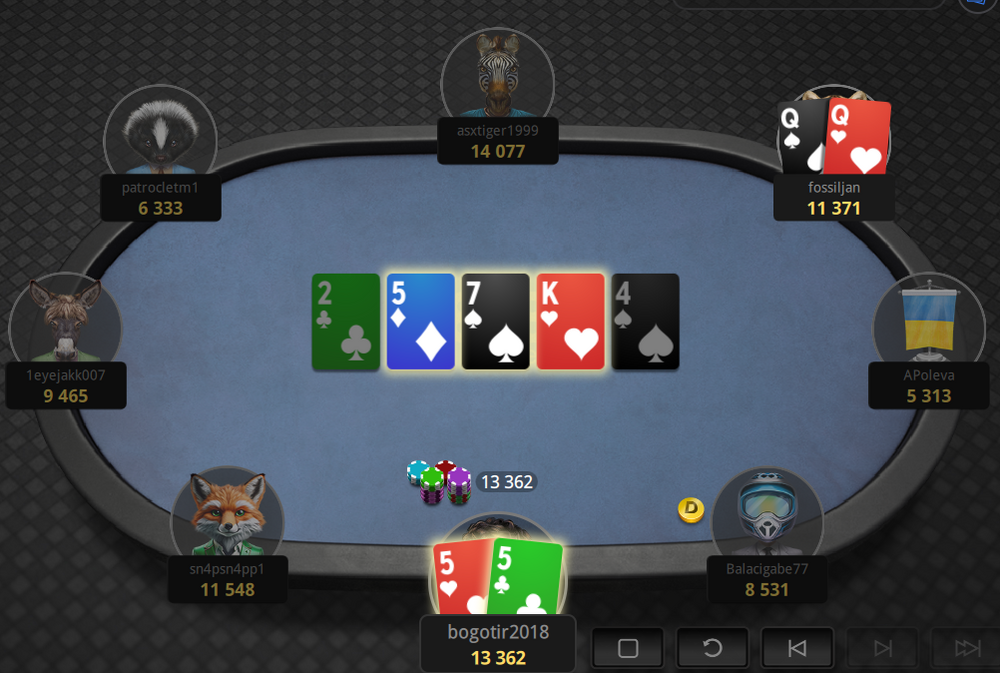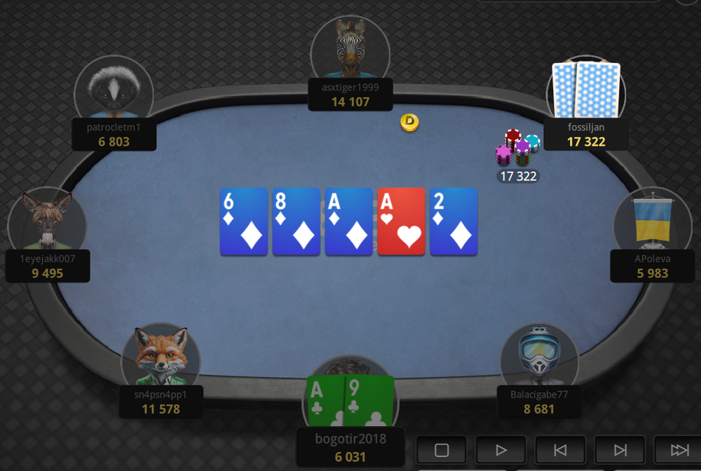 Сьогодні субота та багато турнірів, треба працювати як умога краще. А ще кінець місяця і сьогодні рейтінгові турніри, тому треба зібратись. А щось не виходить зовсім. Граю турнір за $3,30 а зі мною такий агресивний ігрок, що я вже не знаю з чим заходити та як розігрувати карти. На кожні рейзи летять ререйзи, бети, трибети... Граю вже чек/кол та не допомогає проти нього). Спочатку відгрузила йому майже пів стека.