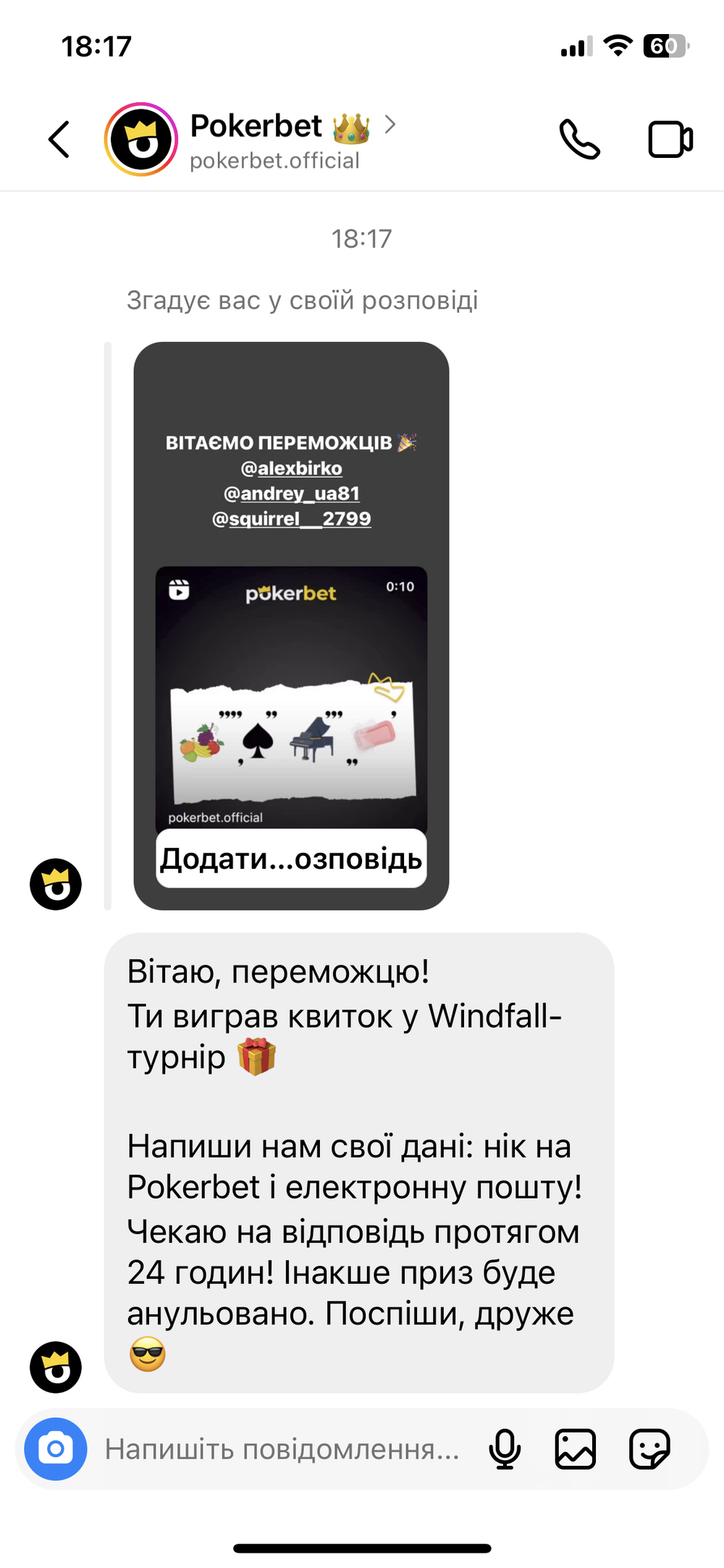 Як і всі я періодично тицяю на кнопочку «взяти участь» в різних телеграмах і інстаграмах)) і от приходить сповіщення саме в інсті, а там