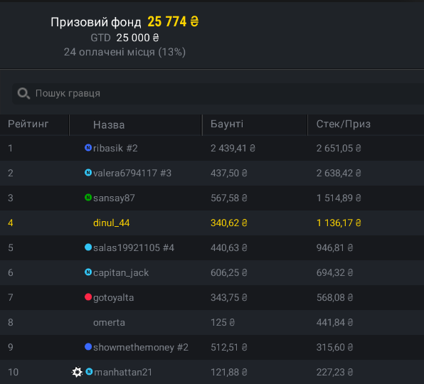 Зайшов на наприкінці пізньої регістрації з коротеньким стеком. Зробив два входи. Загальний час турніру 4 г 48 хв. Кількість входів 175.
