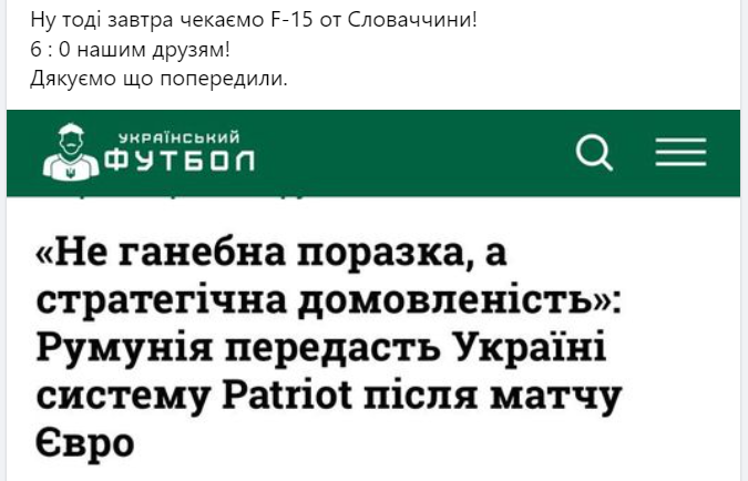 Я б погодився на програш нашої збірної ще й у наступних двох матчах на Євро, якби за це можна було отримати ще дві додаткові системи "Patriot" від Словаччини і Бельгії. Перемога у війні набагато важливіша від будь-яких футбольних здобутків.