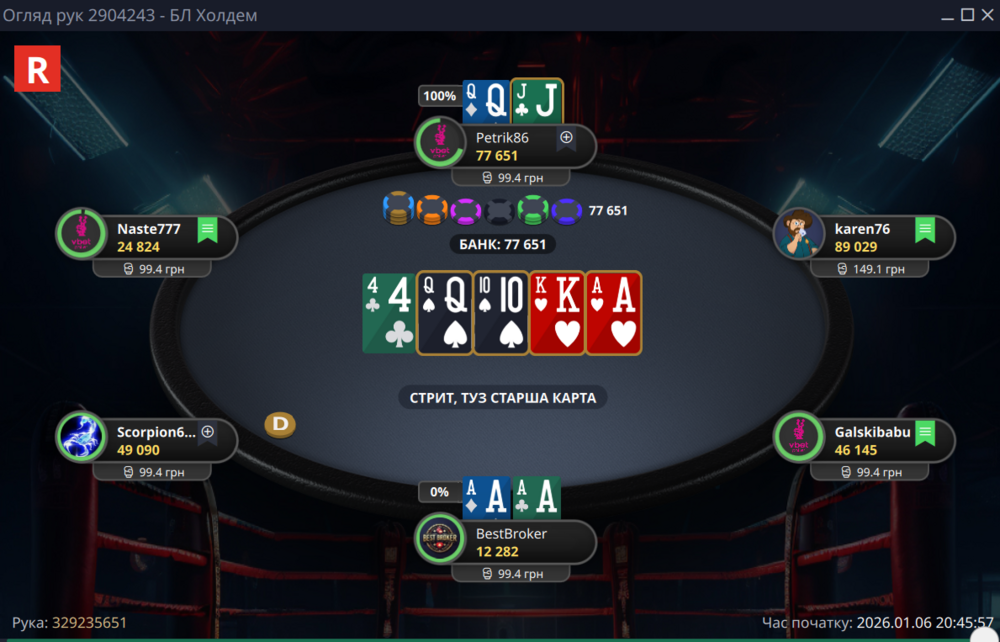 Але потім зміг оговтатися, поступово наростити стек і вирвати перемогу. Остання роздача ХА, у суперника чи у суперниці було 6♠️ 5♠️