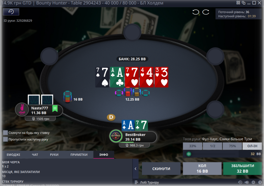 Вчора ввечері у вільне віконце підгрузив турнір Bounty Hunter на Vbet за 165 грн. Вже у другій роздачі, думав що буде як зазвичай - вилечу швидко 😁 Трибет пот і виставлення по флопу залишили мене з маленьким стеком 👇️