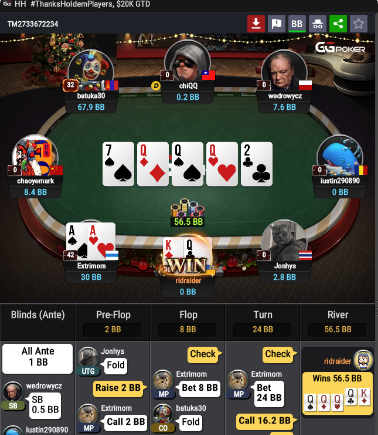 Почалося все з поганої розсадки за афк стіл з одним активним гравцем, у якого більший стек і позиція. Згодом активізувався ще один гравець, стало веселіше. Перед самим розвалом столу сталася роздача яка компенсувала відсутність позиції.