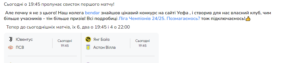 Але почну я не з цього! Наш колега bendar знайшов цікавий конкурс на сайті Уефа , і створив для нас власний клуб, чим більше учасників - тім більше призів! Всі подробиці Ліга Чемпіонів 24/25. Позмагаємось? тож підключаємось!👍️
