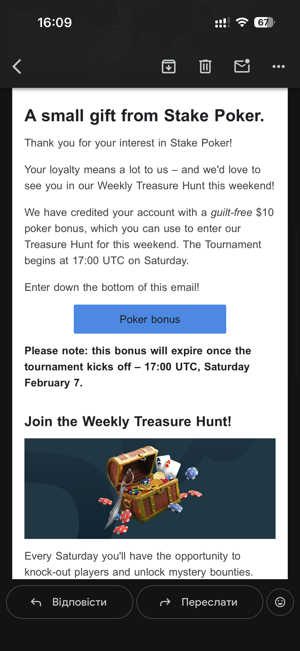 Вітаю! Хто має акаунт на Stake, перевірте пошту. Декому прийшли листи з бонусом на сьогоднішній турнір за $10. Старт о 19:00