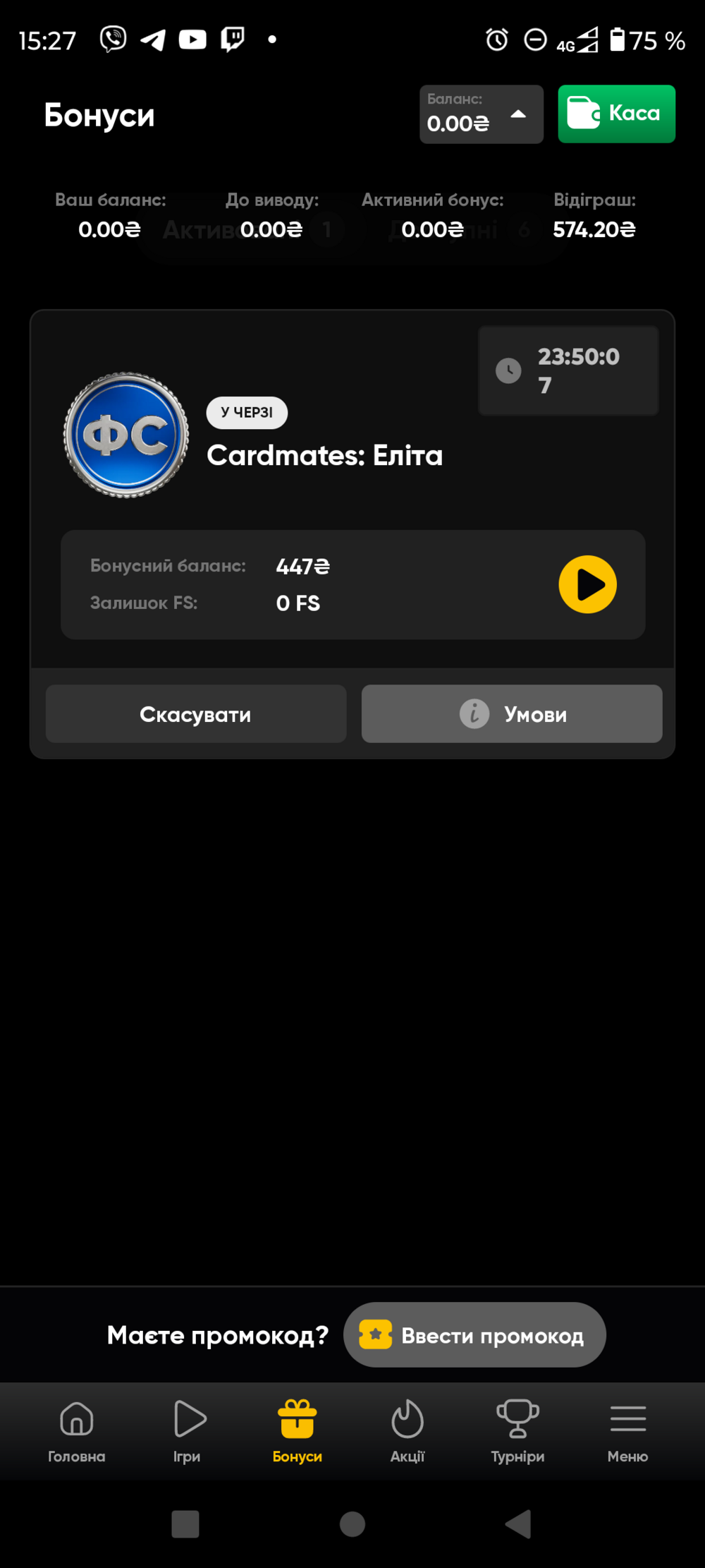 Відіграв я промік, отримав з 50 прокрутив 400+ грн. Але зайшовши в слоти різних провайдерів баланс показує 0. І відіграти промік не можу. Дуже веселе казино.