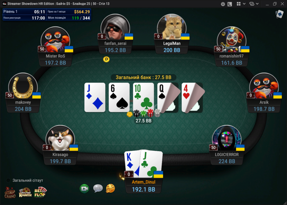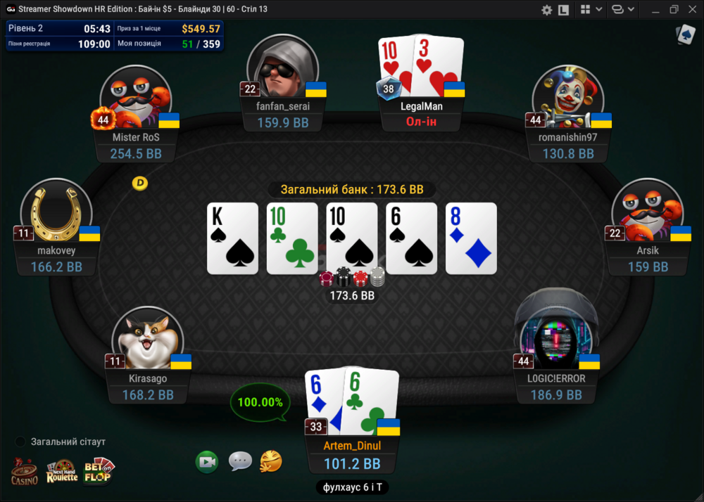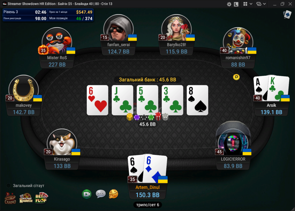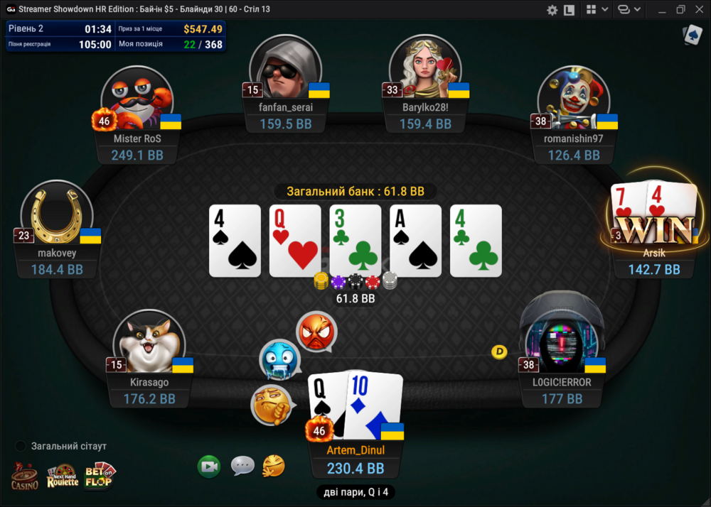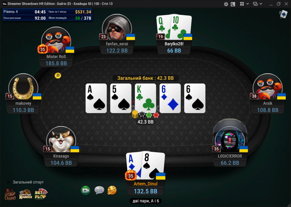 Останню не заскріншотив. Вилетів з А4 одномасними на постфлопі проти АК, якщо не помиляюсь...