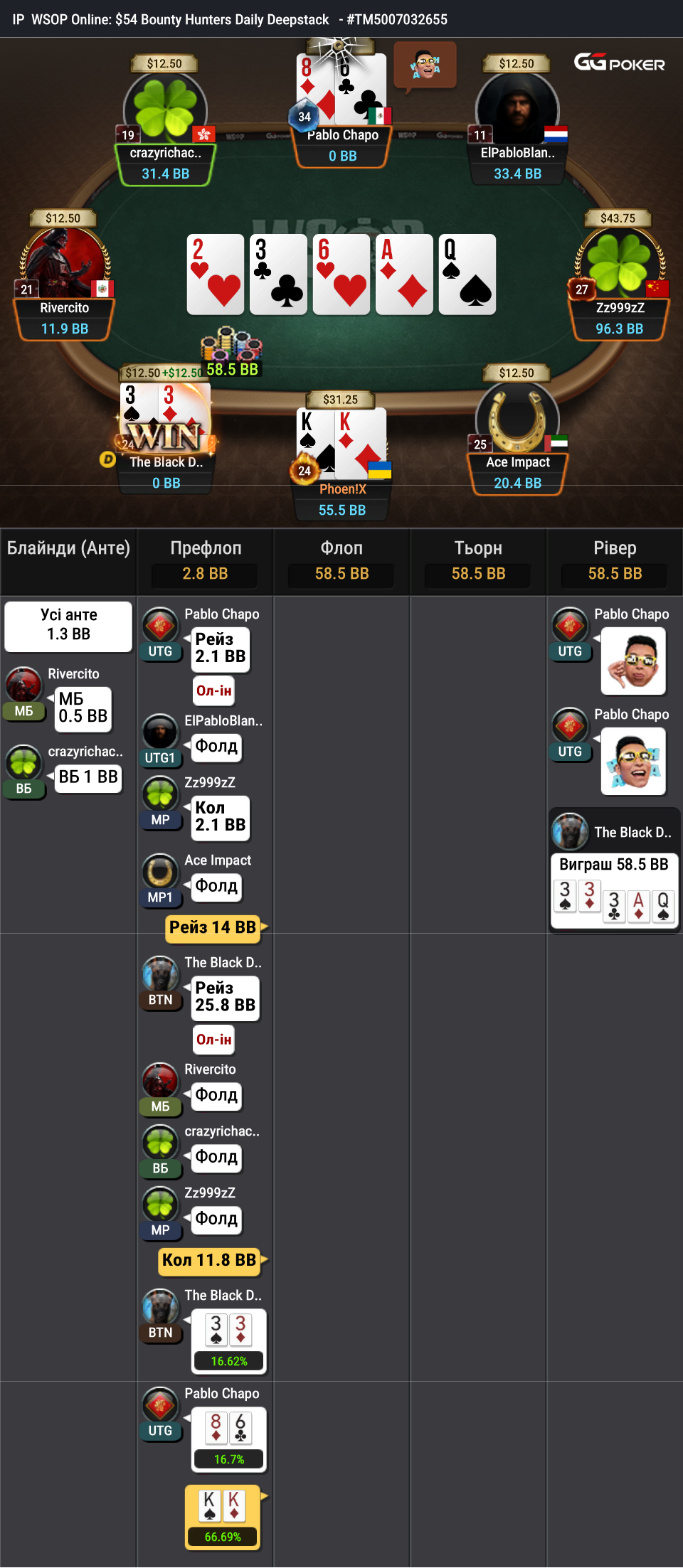 Отже, рядова сесія, ситуація перша: граю фазу, за 100 до проходу отримую АА на УТГ, відкрив, 3 кола. Малий чек, великий донк і по моїй дії на флопі вже видно на скільки ж я задовбався від переїздів топ руки, на дошці де є багато дро, я просто пуш граю, якщо хоче тягнути, то дорого, бо я вже задовбався, але колить не великий блайнд, а малий, хоч і після роздумів та це все рівно погано, бо сет чи дві пари, то не добре, але там оказуються десятки і у мене 91% на перемогу і 80ВБ за 100 до проходу, ідеальна ситуація