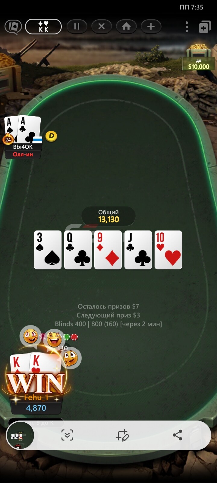 Два вилетів в топ 4 чисто поспішив,а ще один витягнув золотий 10$ і фінальна роздача прибити так москаля то ляпота)