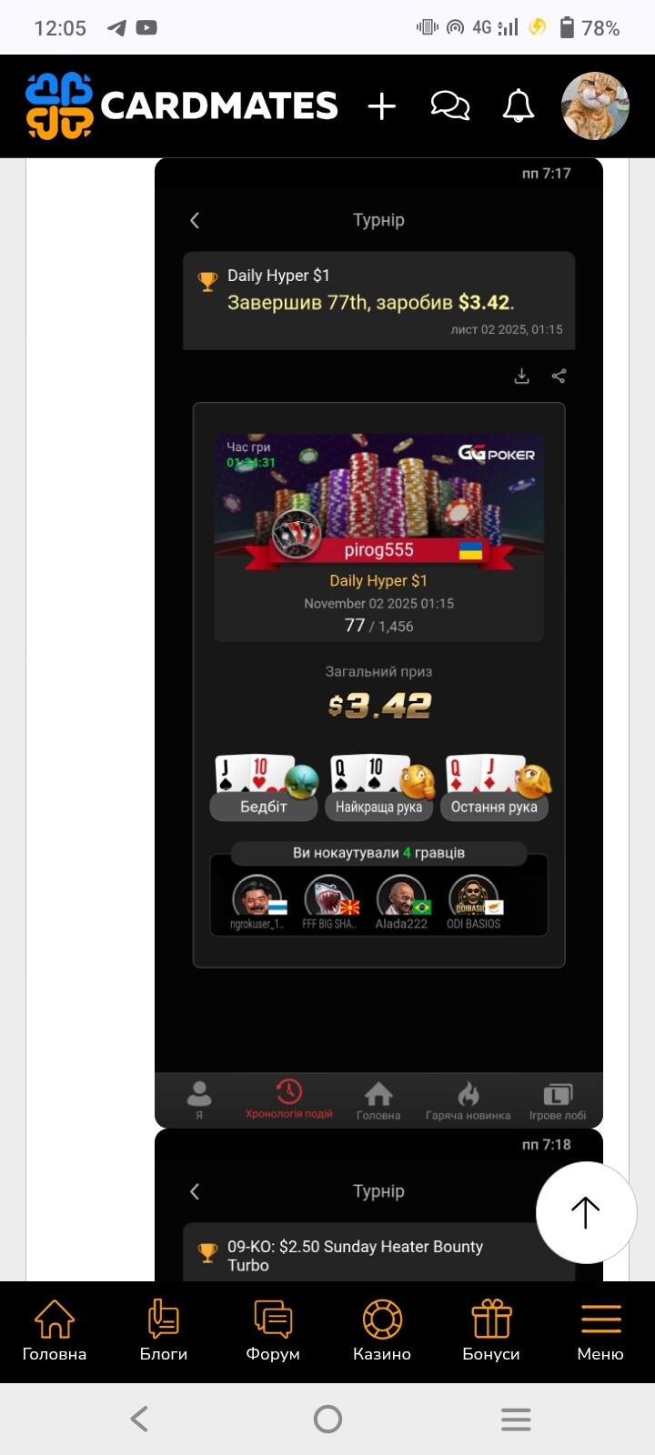 Ось на скріні pirog555 зайняв 77 місце із 1456. Це дуже хороший результат, ввійшов майже в тор 5% турніру. А виплата - менше, ніж 4х баїну. Тому що в цих кілополянах всі гроші знаходяться в топ 3, а потрапити туди дуже складно, крім майстерності треба ще дуже багато удачі.