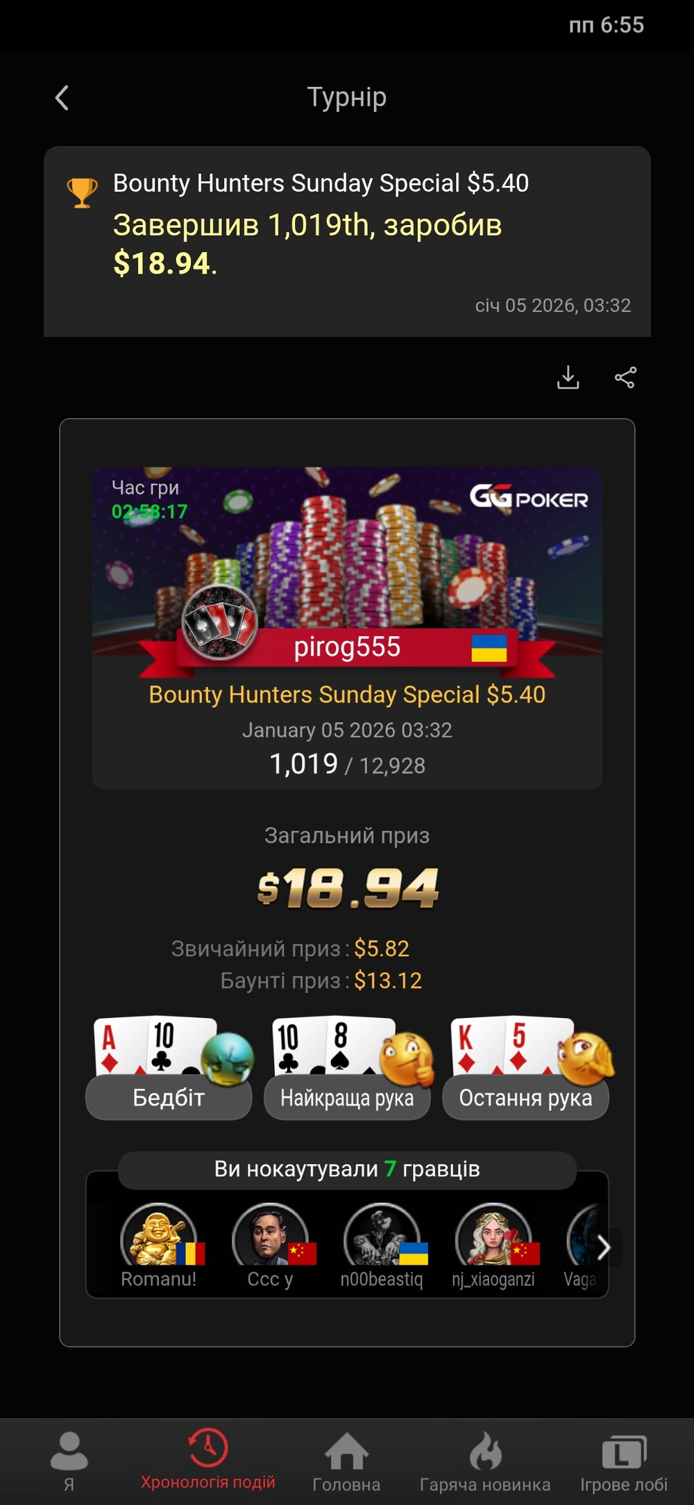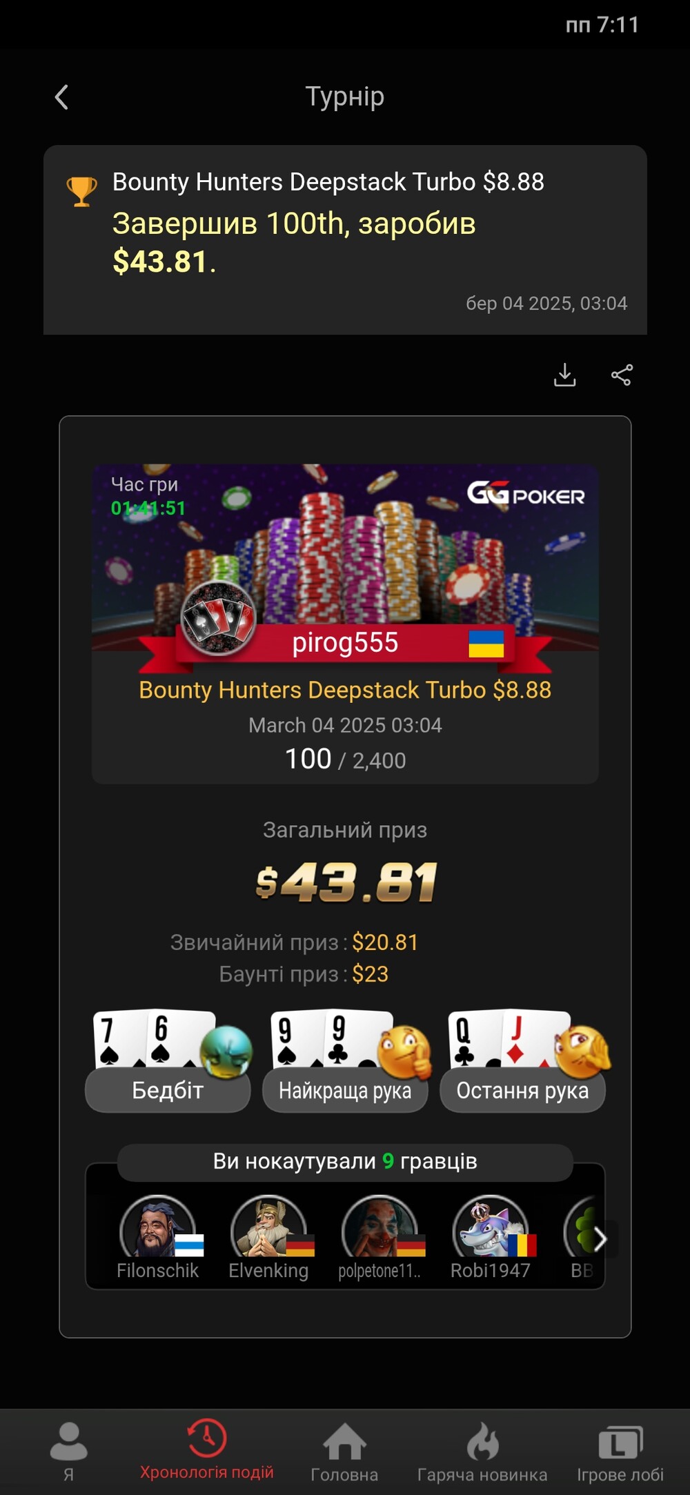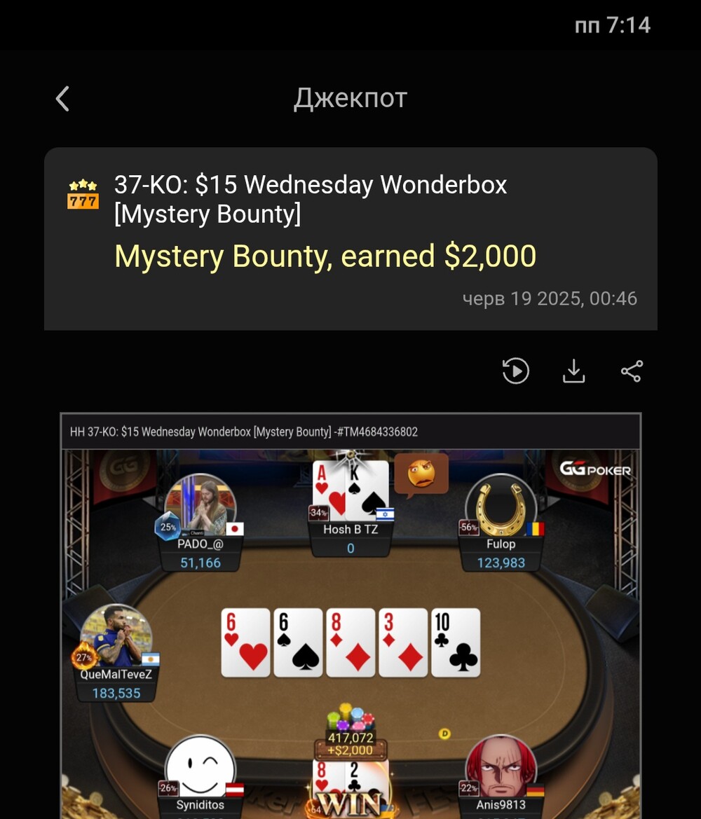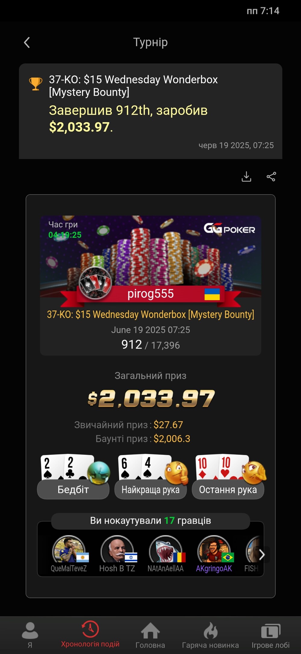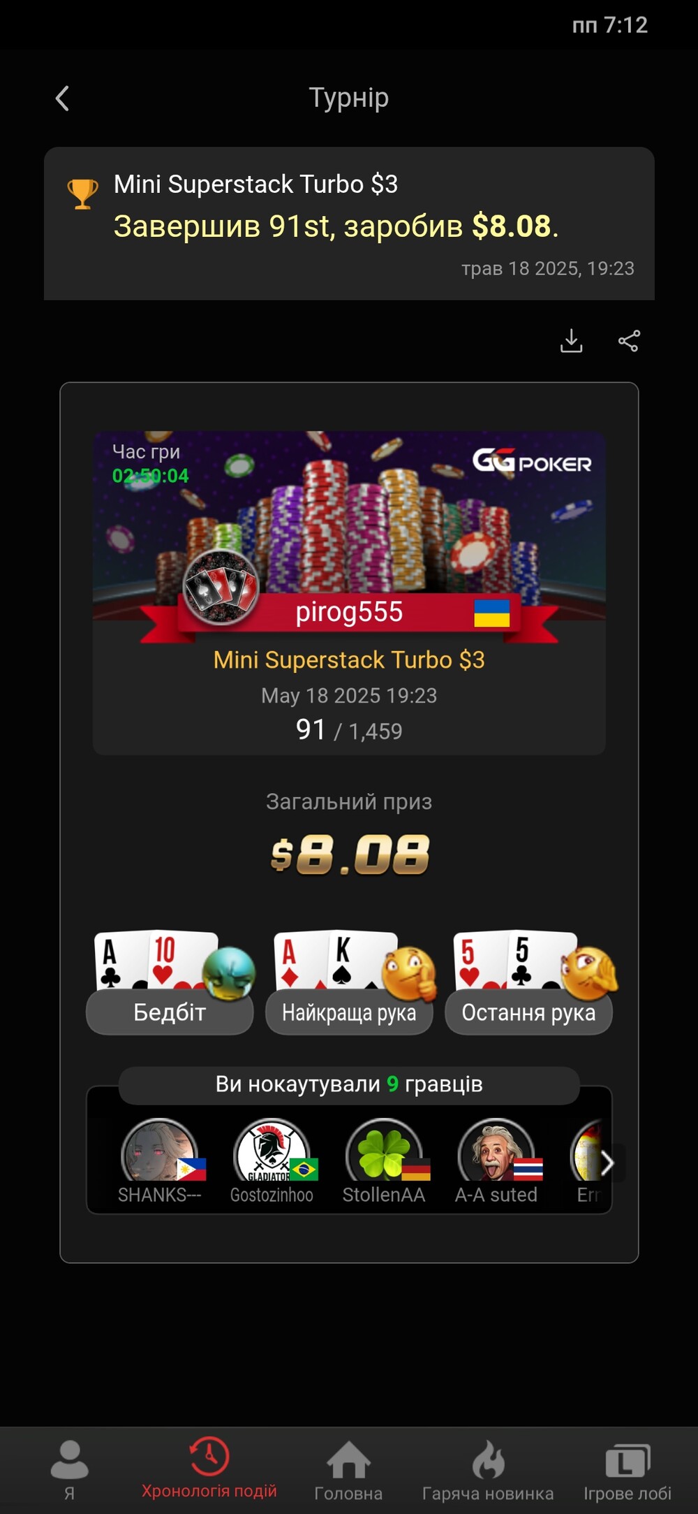 Так напевно так і зроблю буду шукати турніри де менше , бо практично 75% я в топ 20 там із 2000 гравців півтори години сижу і все сливаю начинаю в себе вірити що кожна роздача моя.