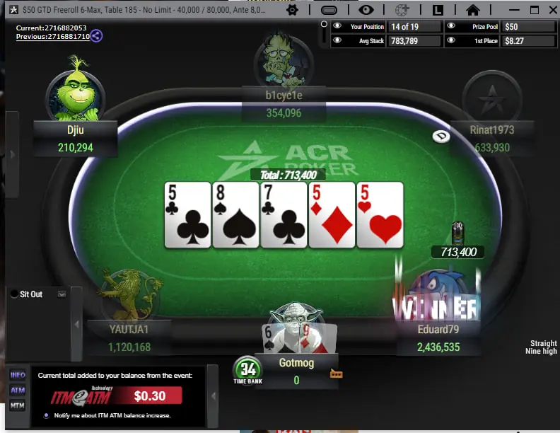 16.04.2026 Рум ACR. $50 GTD Freeroll 6-Max. Кількість учасників - 1241, кількість призових місць - 180