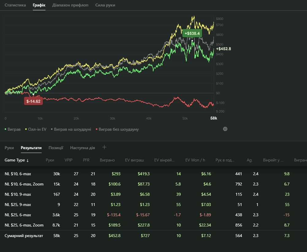 Сьогодні в більшості грав зум,бо на звичайних столах Старзи зробили що всі столи в червоній темі і це змінити не можливо,і мені розпливаються карти і статистика,якщо так ще буде декілька днів то або зміню або добавлю ще один рум,бо це жахливо