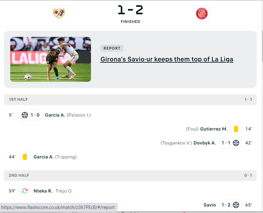 Черговий переможний матч Жирони проти Райо Вальєкано і перше місце в таблиці. Звичайно, не без участі наших хлопців. Як і минулого туру Довбик забиває з асисту Циганкова. Приємно за наших. І знову вольова перемога.