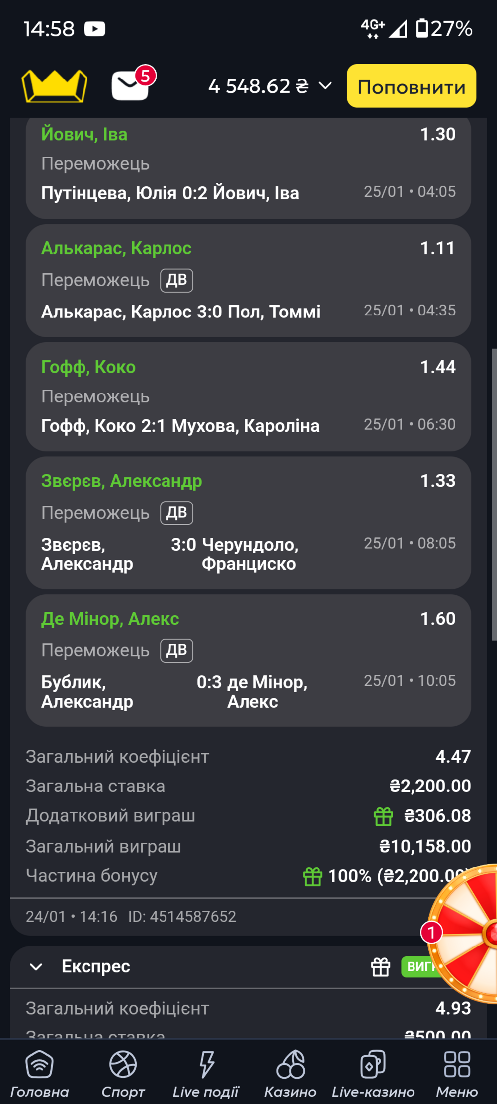 Вчора зіграла моя ставка на 🎾 і не прогадав